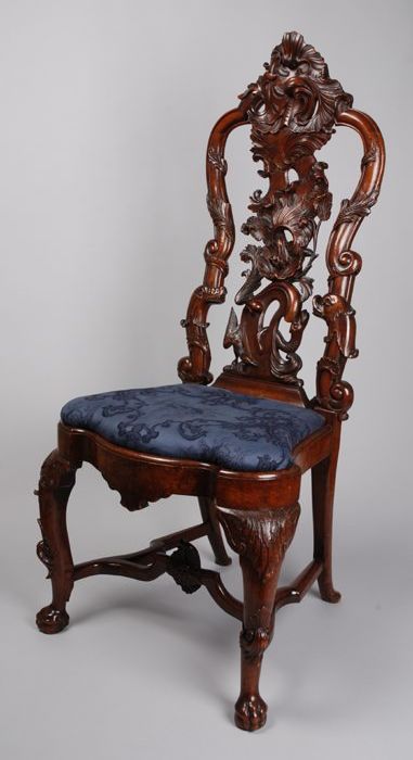 Rococo stoel met zeemonster en hond in de rugleuning