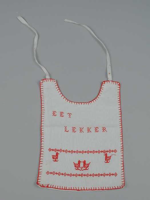 Bavet van katoen waarop geborduurd in rood "eet lekk...