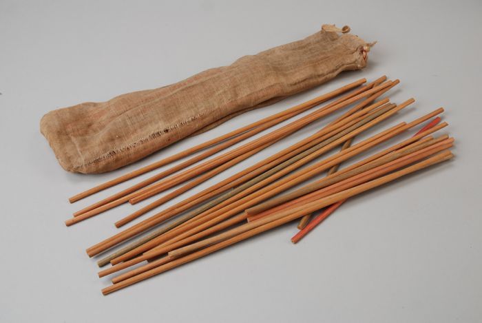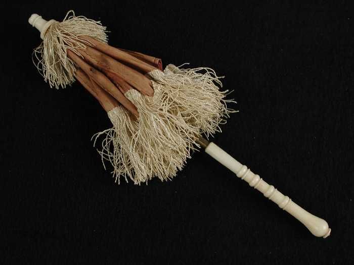 Fragiel zakje van kaaslinnen met daarin houten staaf...