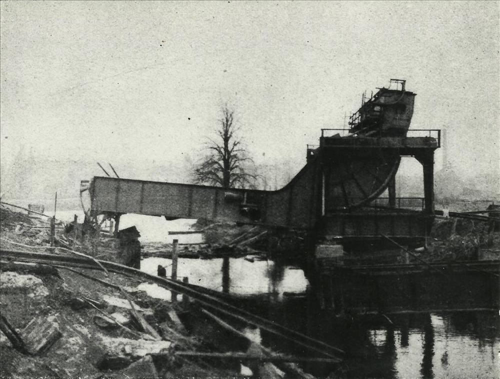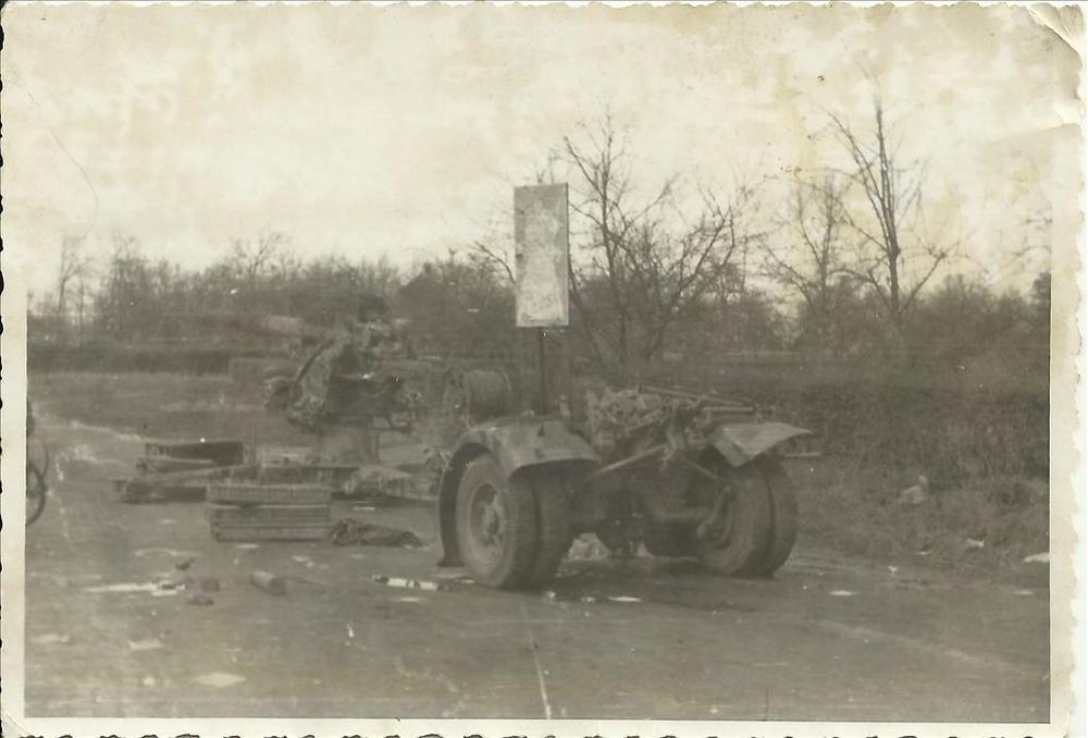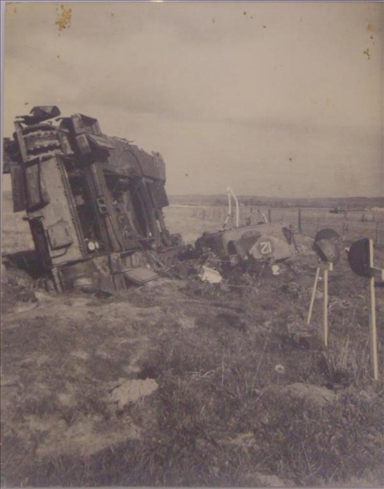 Foto (op spaanderplaat) van een kapot geschoten tank...