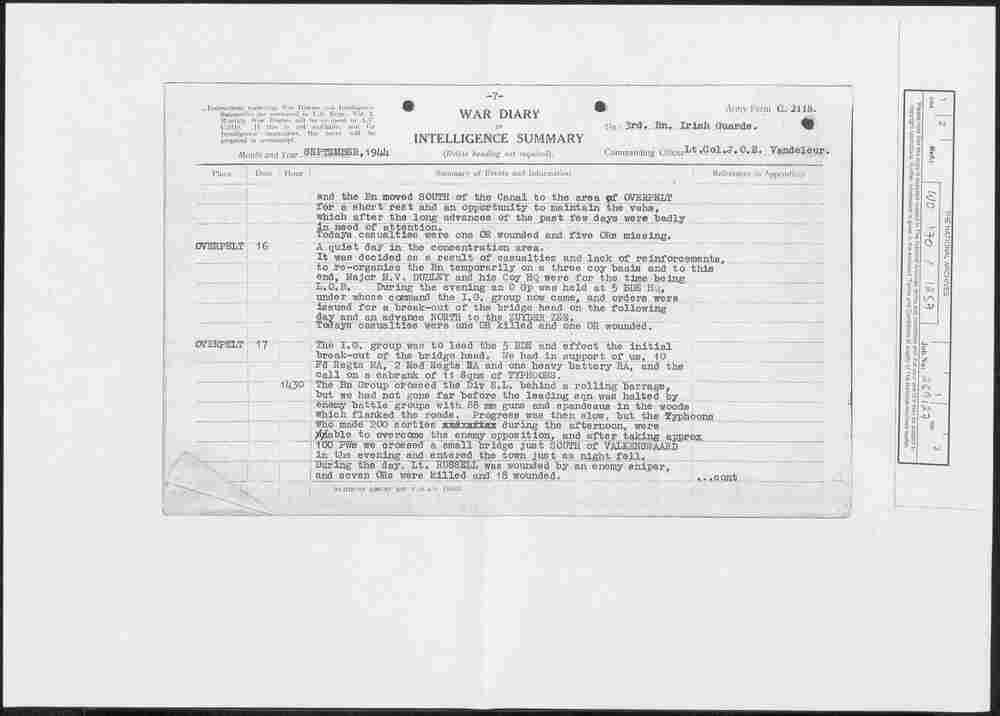War Diary for 3rd (Motor) Bn, Irish Guards, 1-30 Sep...