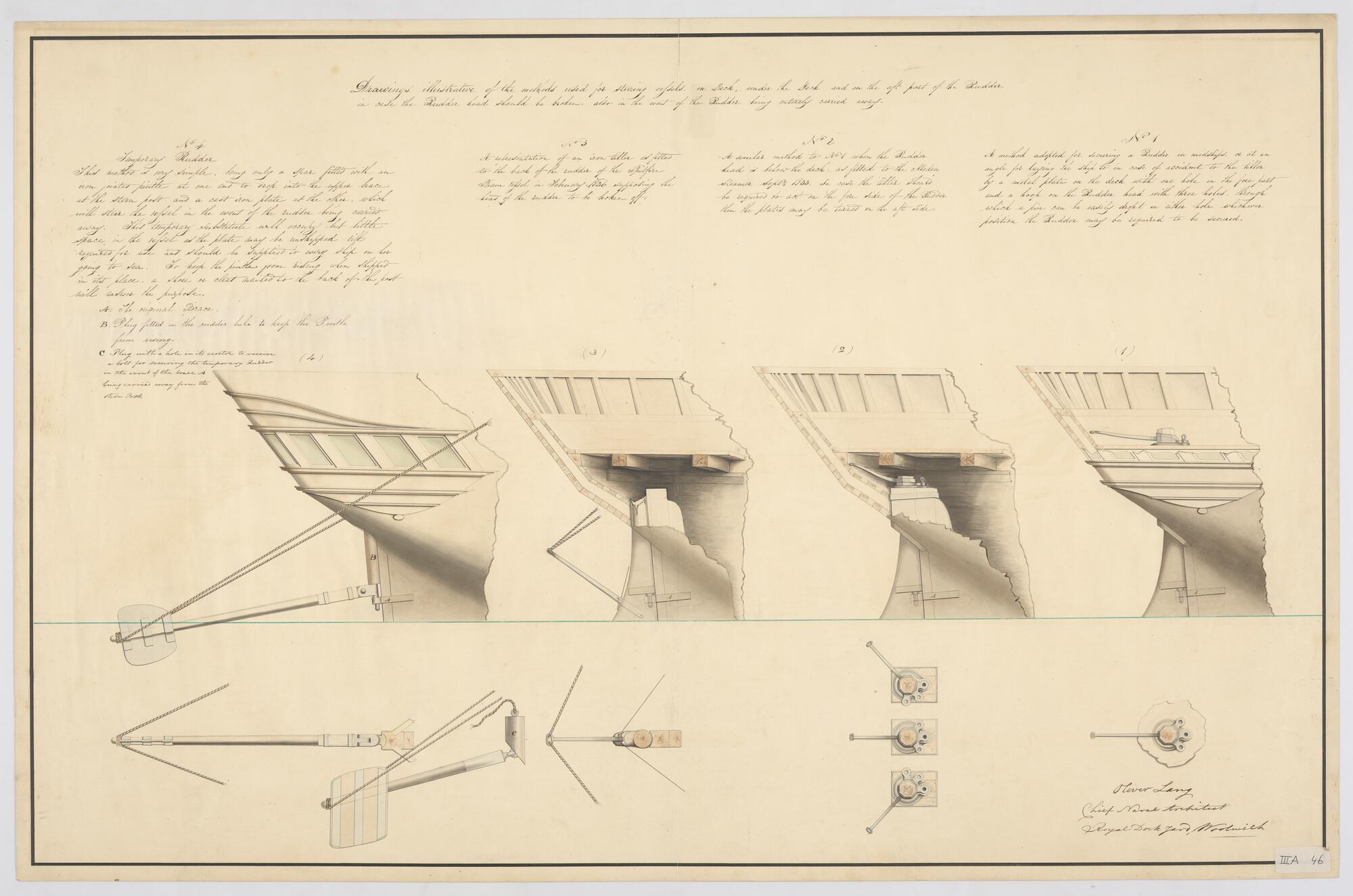 Zijaanzichten van een oorlogsschip met noodroerconst...
