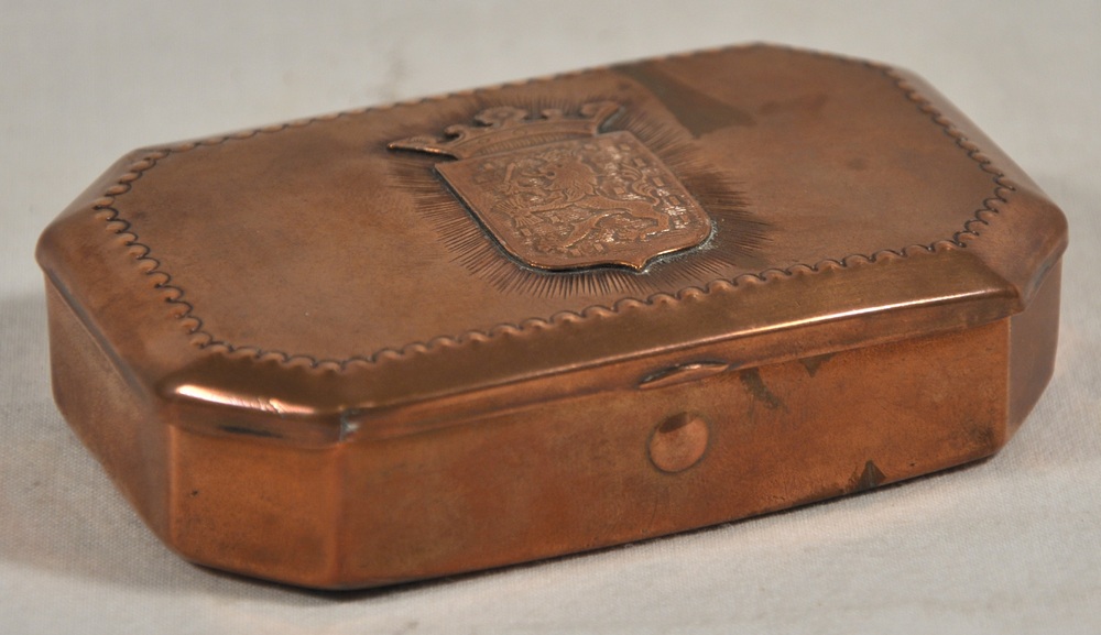 Snuifdoos of tabaksdoos van koper met een voorstelli...
