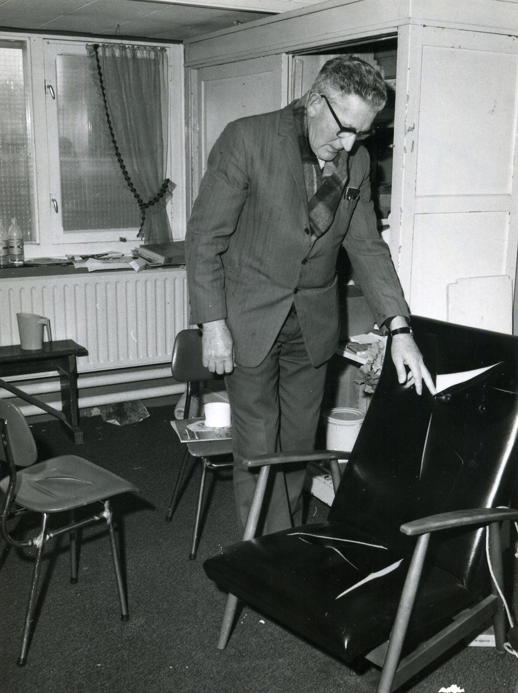 Zwart-wit foto van het vandalisme in het huis van He...