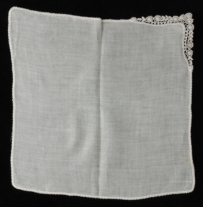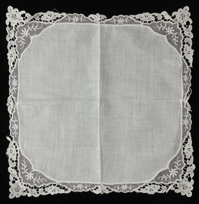 Vierkante zakdoek van fijn wit batist met brede rand...