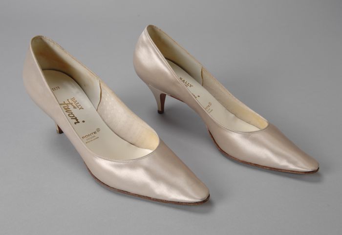 Crèmekleurige zijdesatijnen pumps met smalle hoge ha...