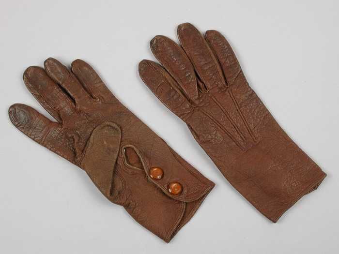 Paar korte kinderhandschoenen van bruin leer met tra...