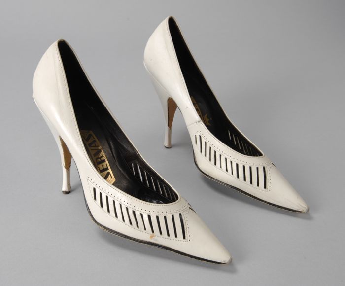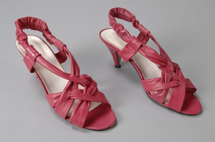 Paar damesschoenen met hoge hak, gevlochten banden v...