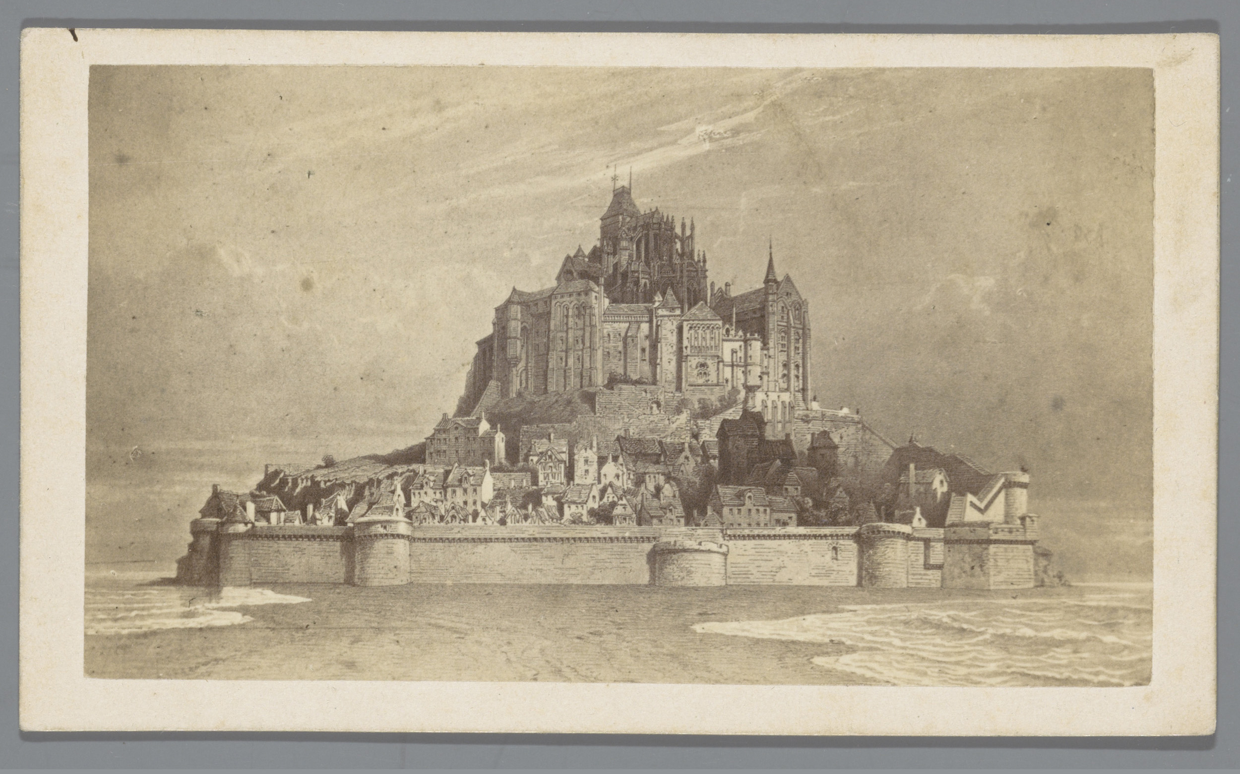 Fotoreproductie van een prent van Mont Saint-Michel