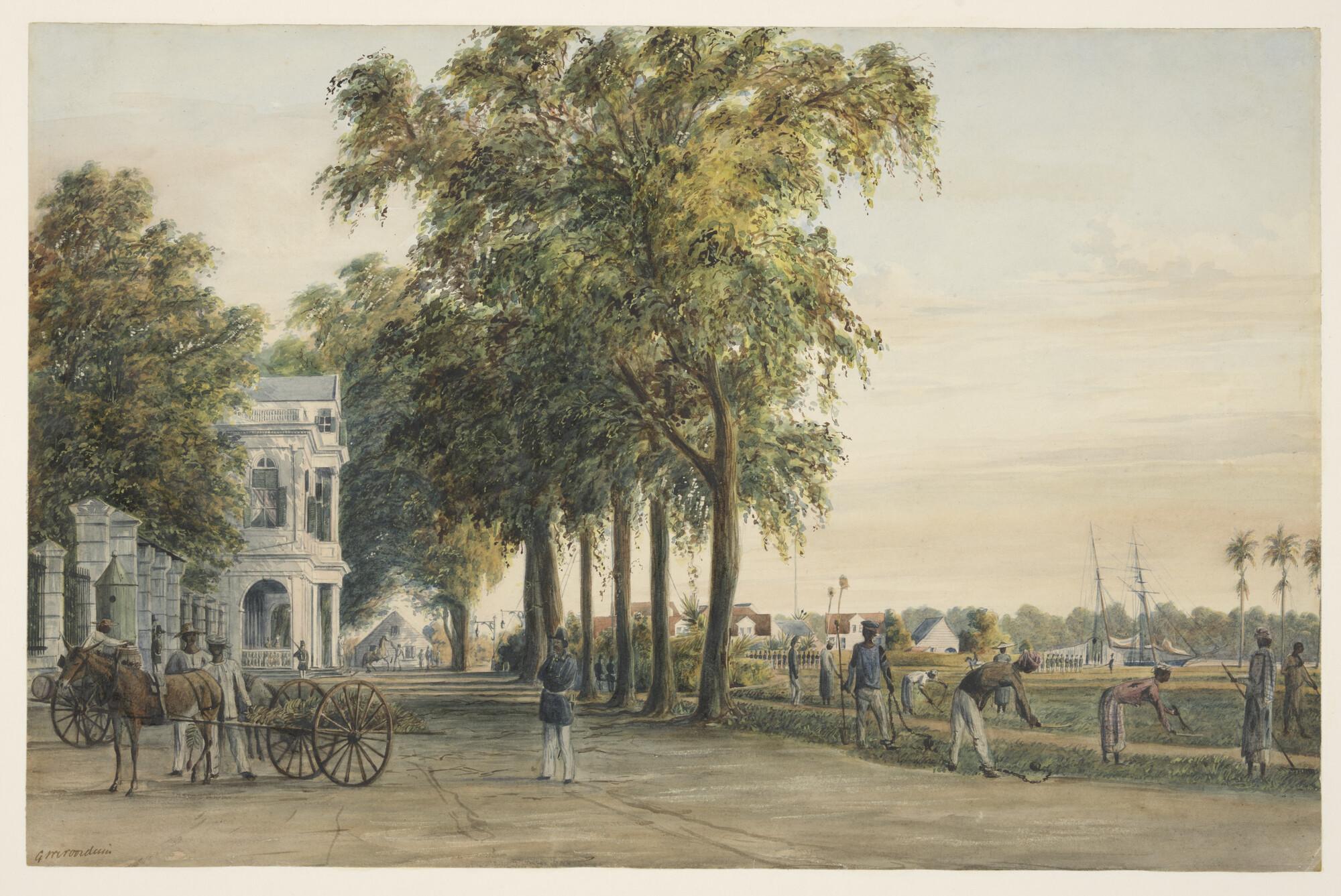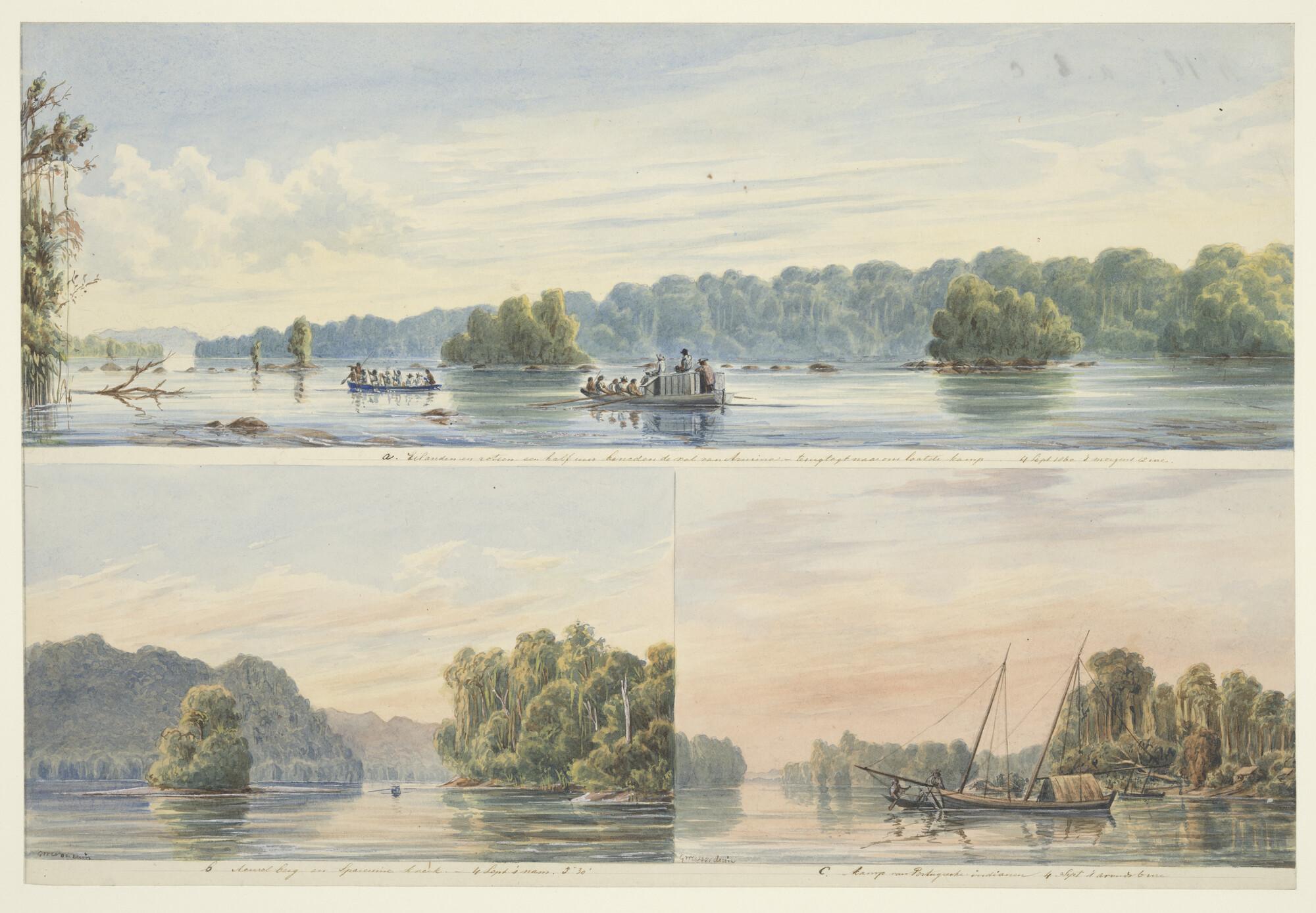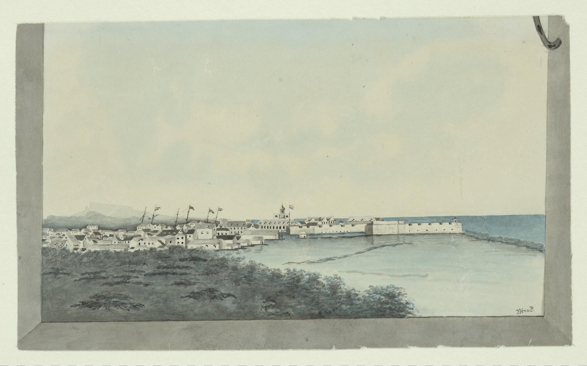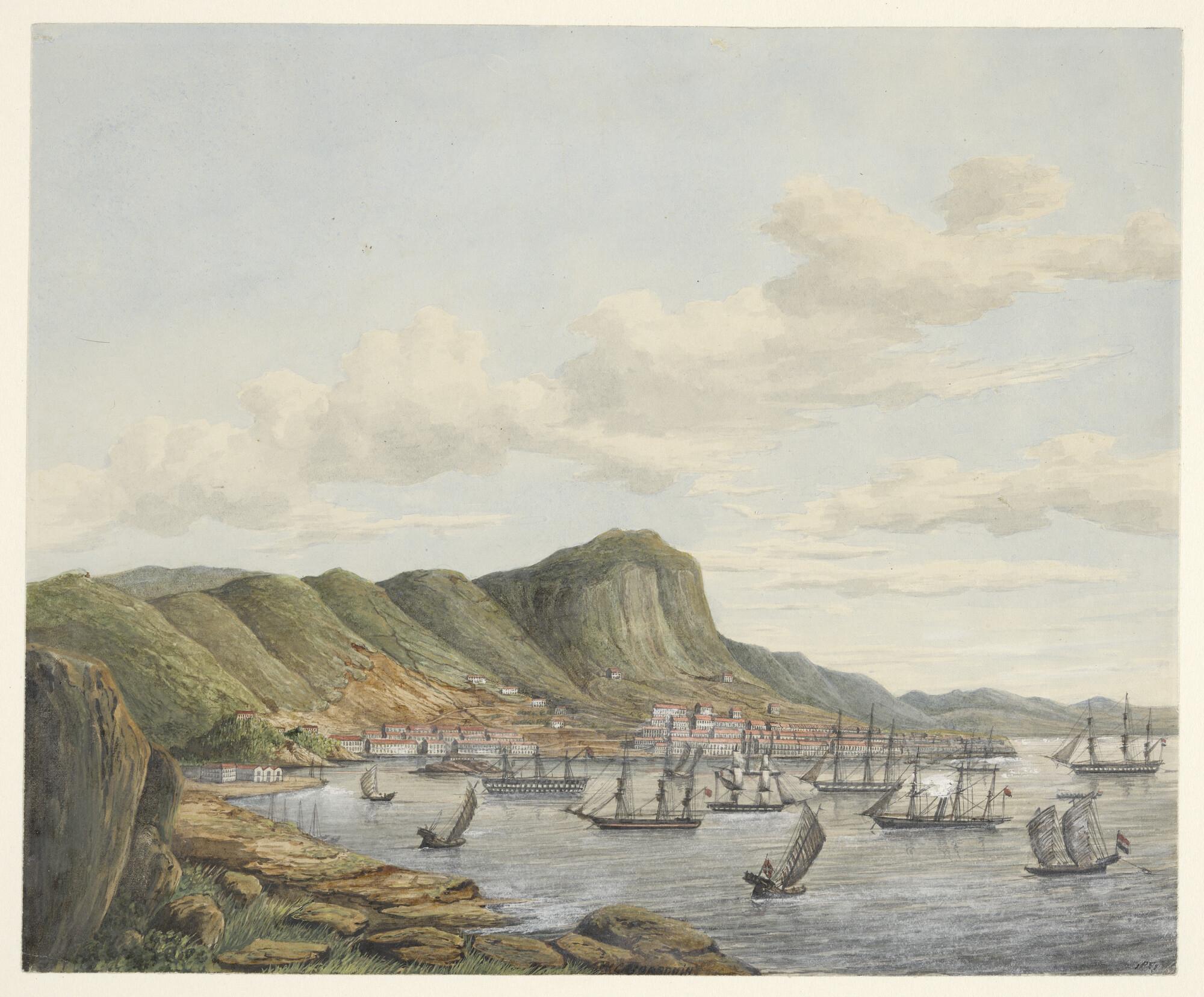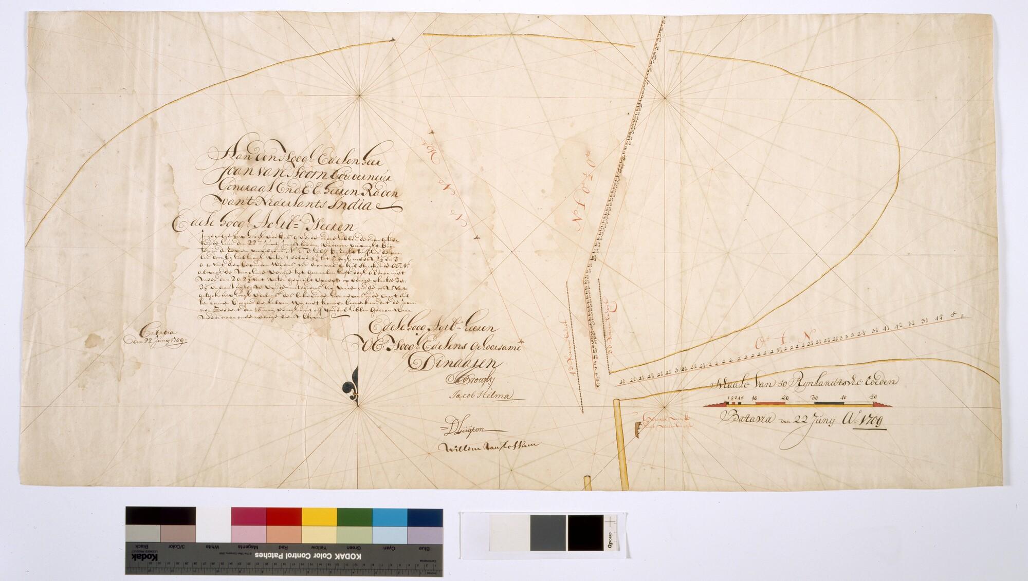 Gekleurde handschriftkaart van de rede van Batavia m...