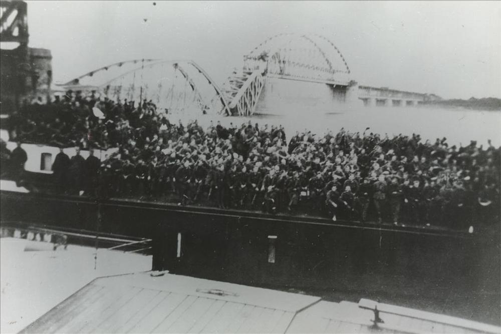Grote groep Belgische krijgsgevangenen aan de waalka...
