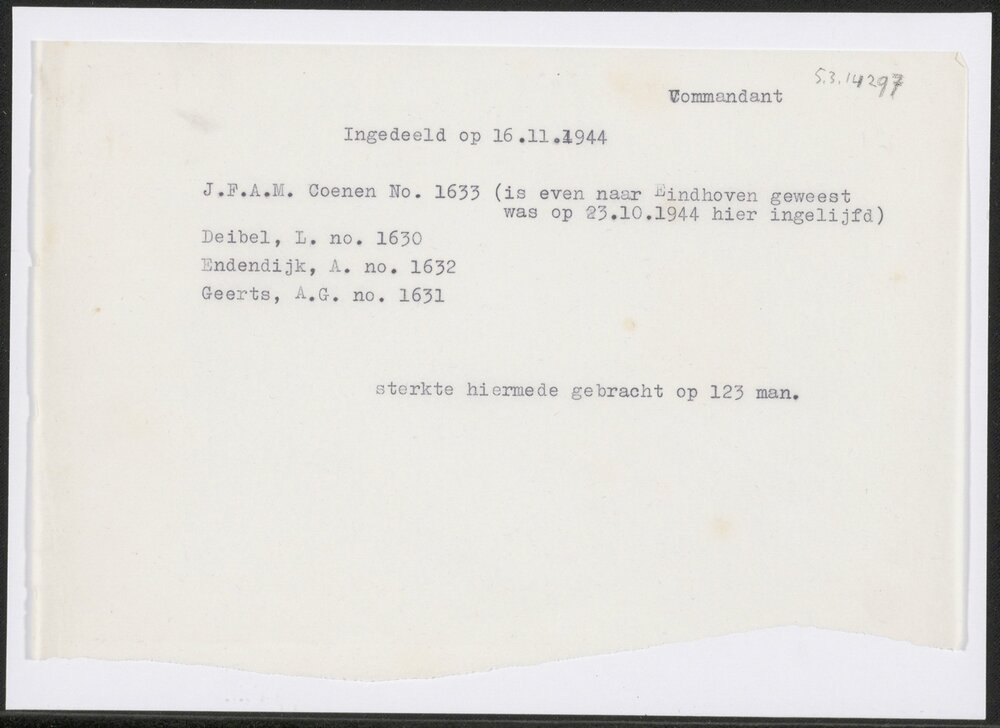 Namenlijst met indelingen op 16 november 1944 en opm...