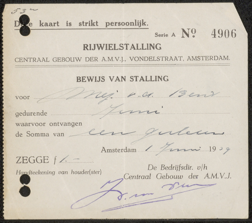 Bewijs van storting van 5 gulden op giro 68500 , t.g...