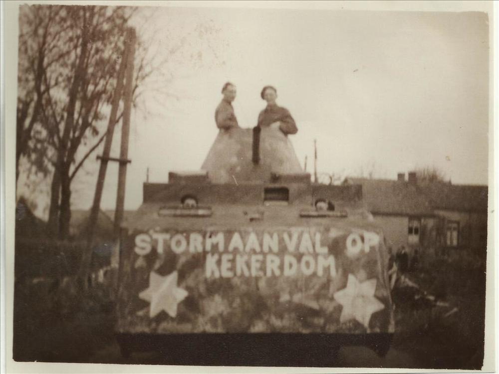 Bevrijdingsoptocht november 1945, mannen op kar 'sto...