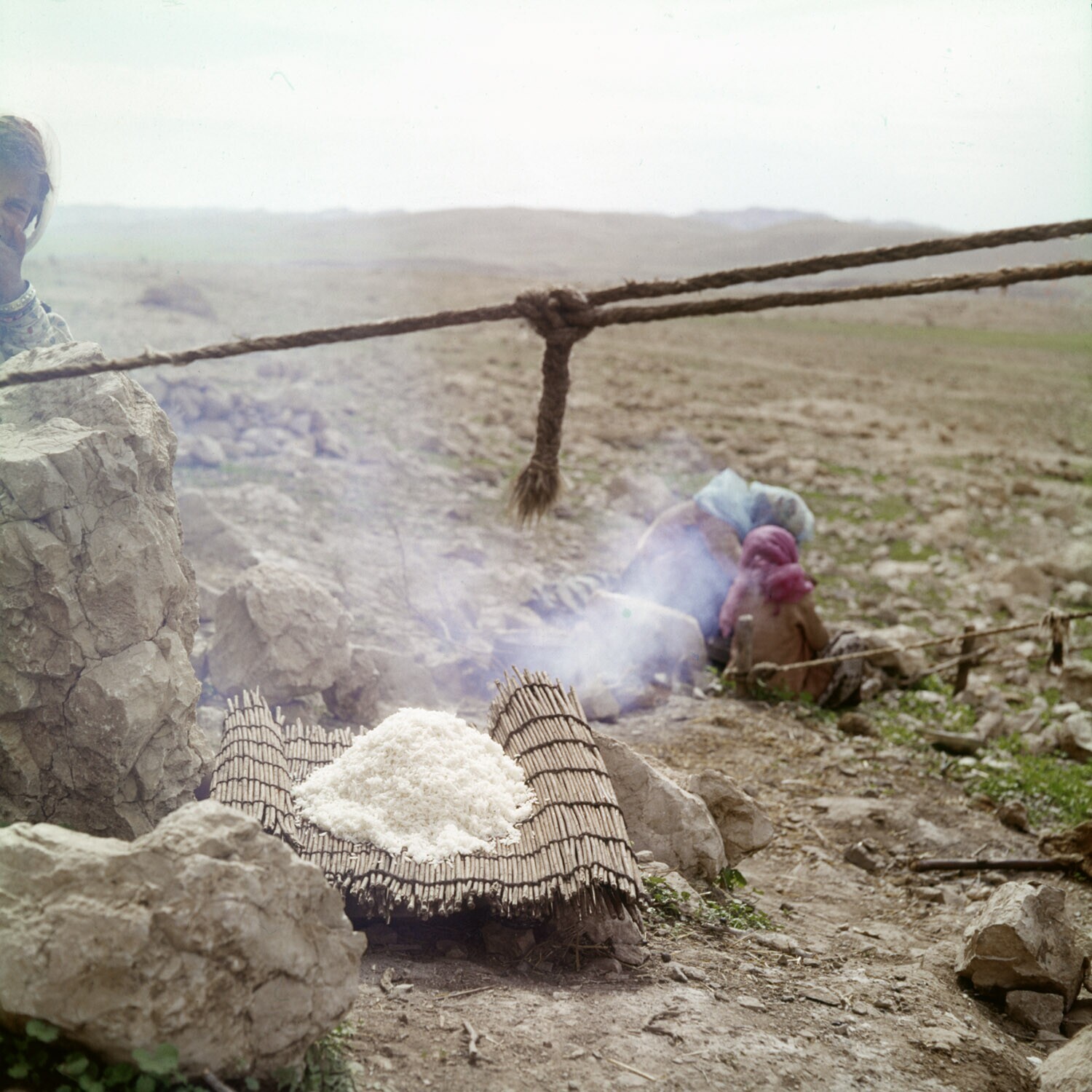 Sen vrouw maakt de rijst schoon. In N. Iran aan de v...
