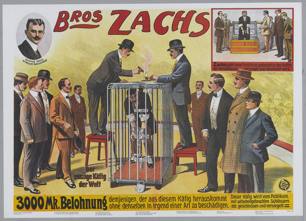 Bros Zachs. Boeienkoning in kooi die door twee manne...