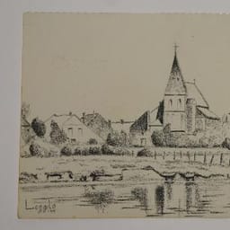 Boerderij met hooiberg aan een waterkant. Op de acht...