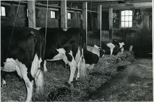 Foto in zwart-wit van koeien in een ligboxenstal doo...