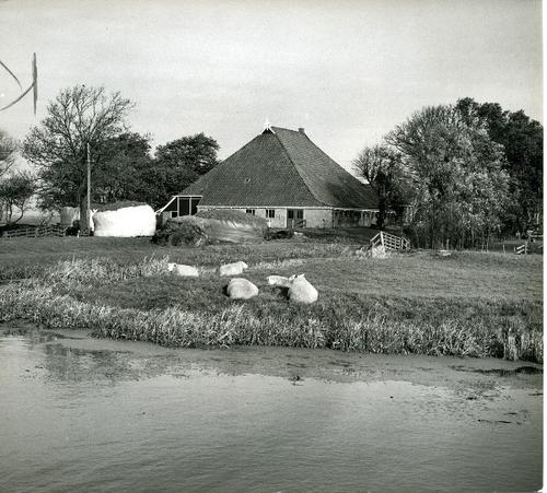Foto in zwart-wit van een stelpboerderij aan een bev...