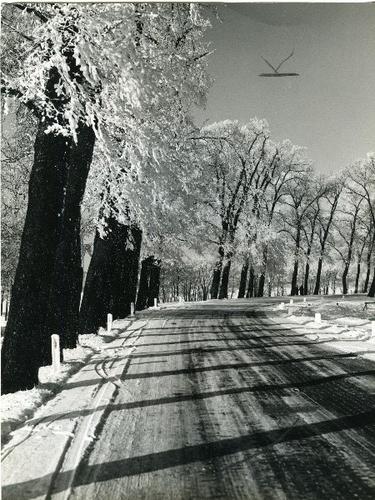 Foto in zwart-wit van een besneeuwde weg met berijpt...