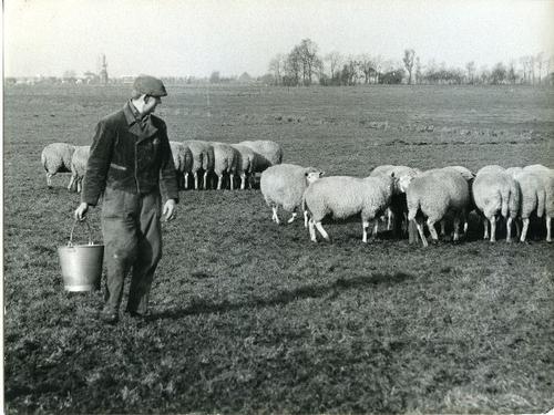Foto in zwart-wit van schapen rond een voederbak doo...