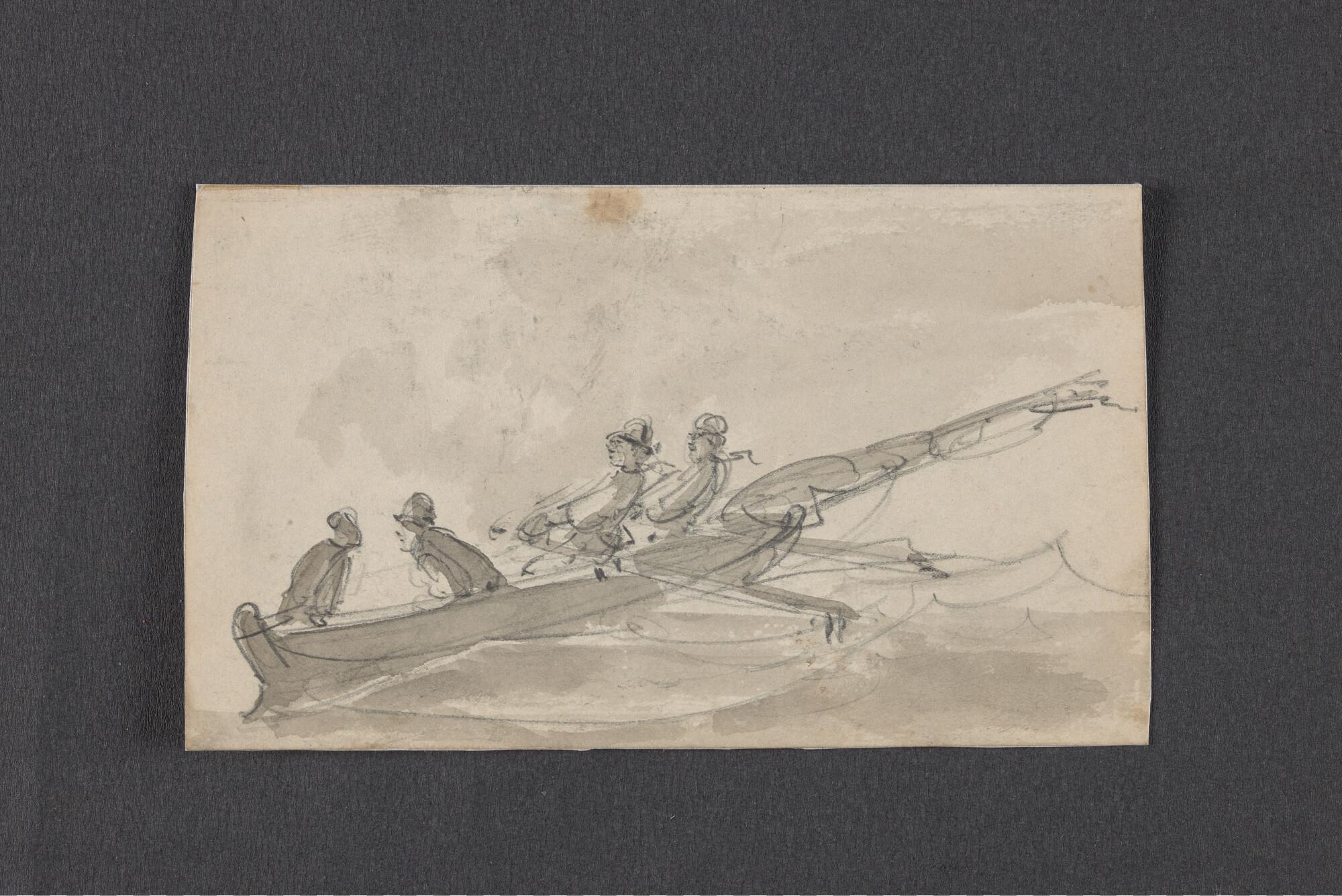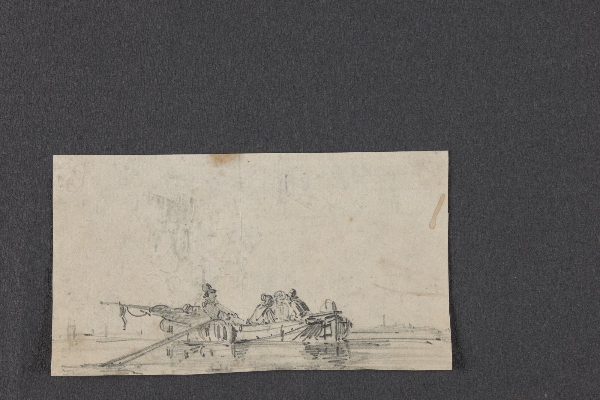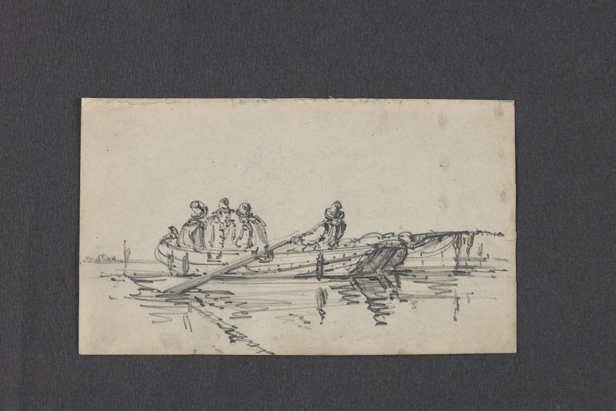 Schuitje met roeier en drie passagiers en schets van...