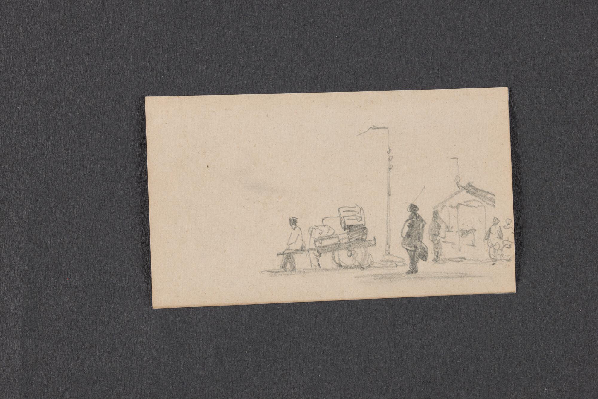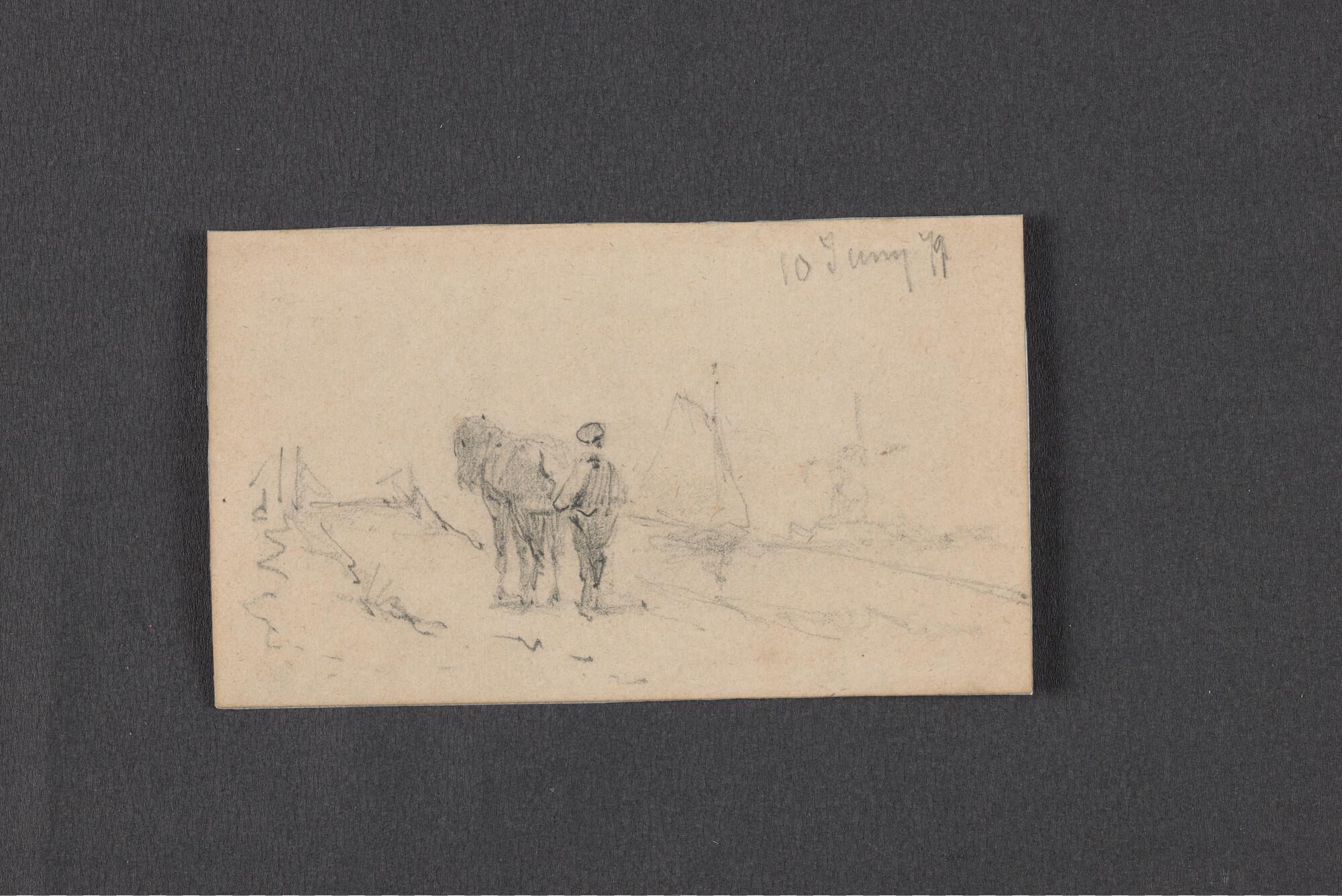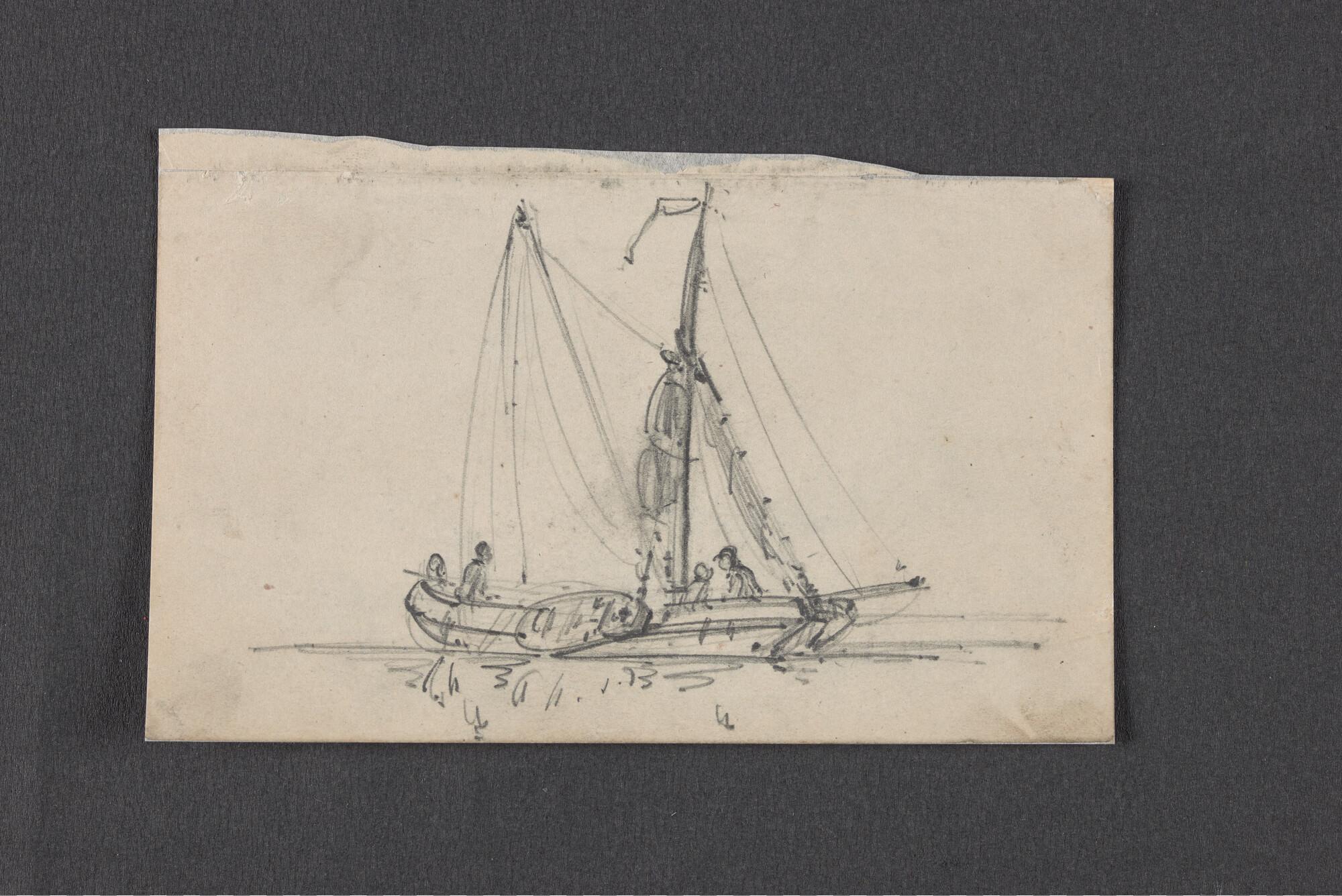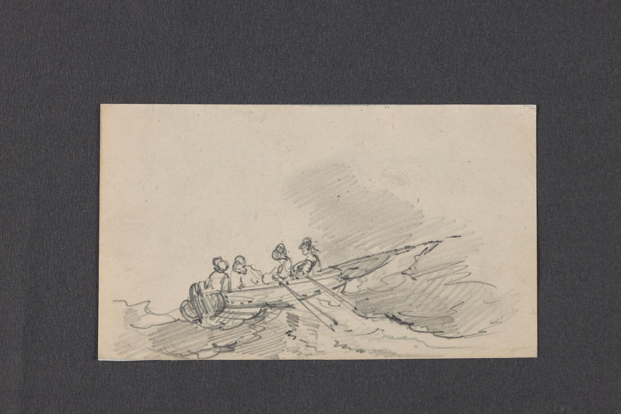 Schuitje met roeier en drie passagiers en schets van...