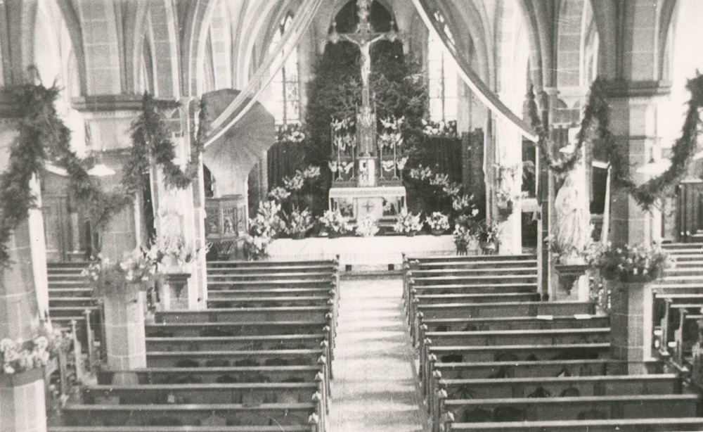 Zwart-wit foto van het interieur van de R.K. St. Mar...