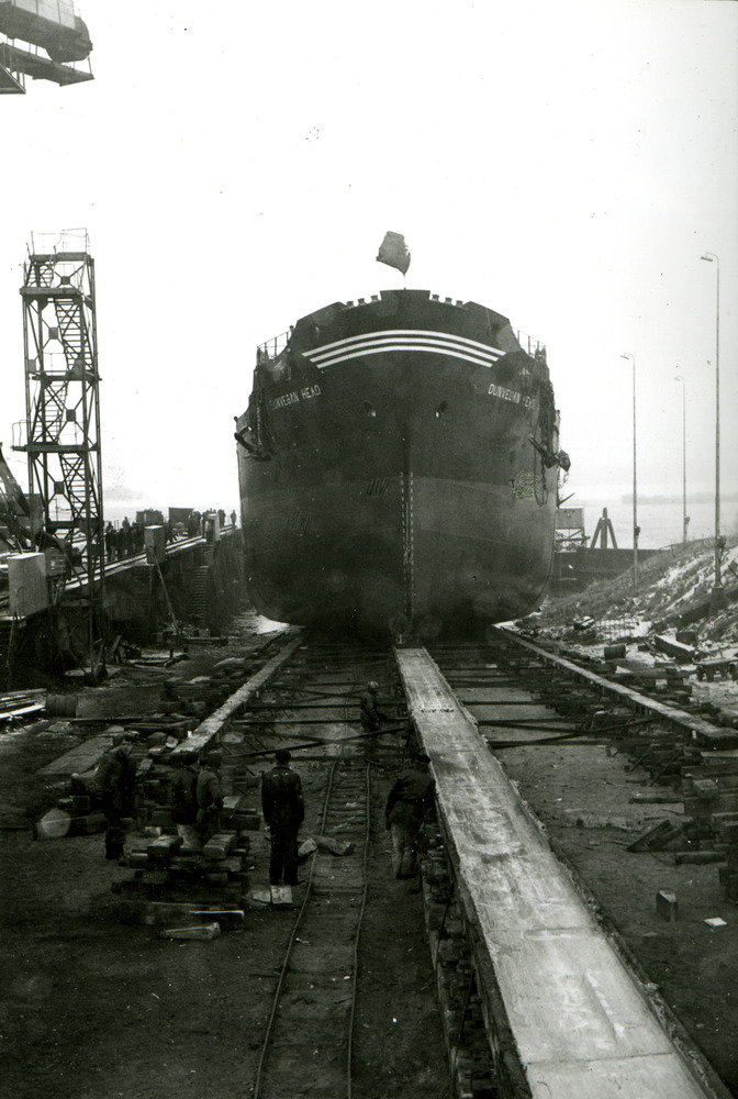 Zwart-wit foto van de tewaterlating van een schip in...