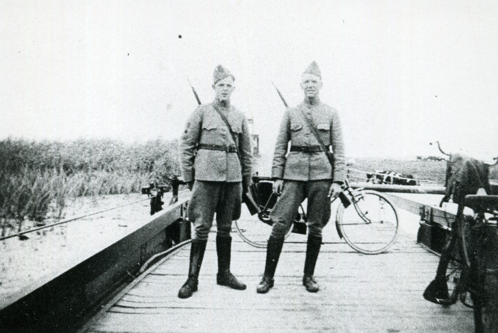 Zwart-wit foto van de bewaking van het veer tussen A...