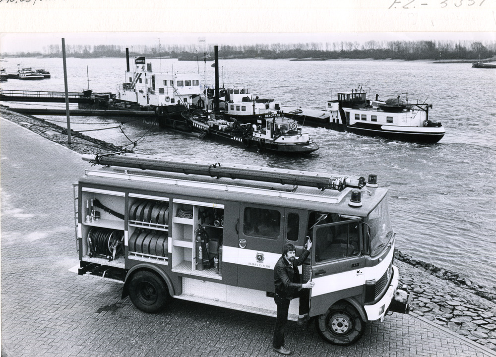 Zwart-wit foto van de nieuwe brandweerauto van Lobit...