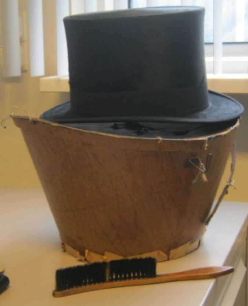 Zwarte hoge hoed van textiel in doos van karton met ...