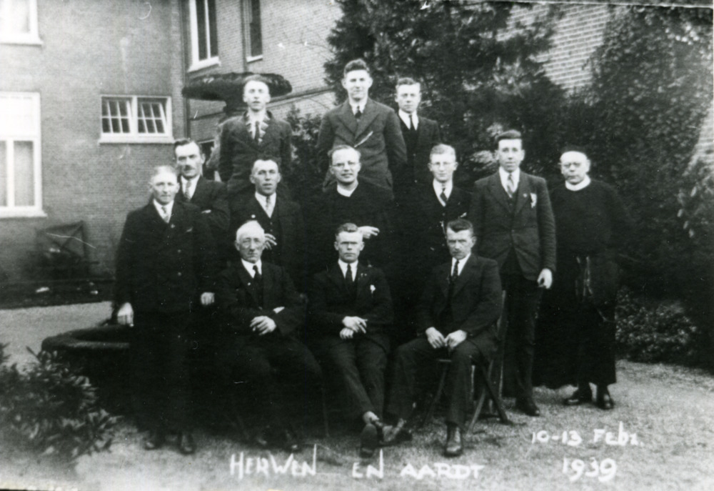 Zwart-wit foto van deelnemers aan een retraite in He...