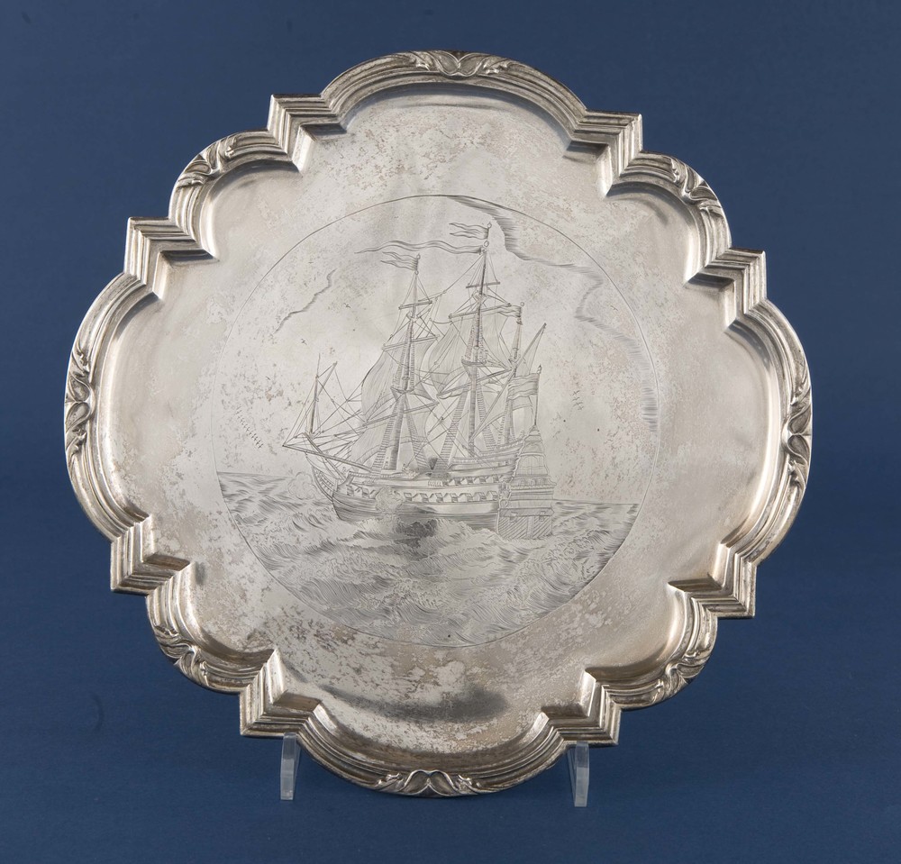 Schenkbord op voet met brede buitenrand, van zilver,...