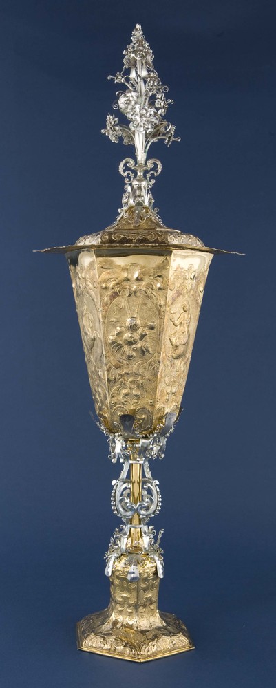 Bokaal van zilver en goud, op voet, met rijke graver...