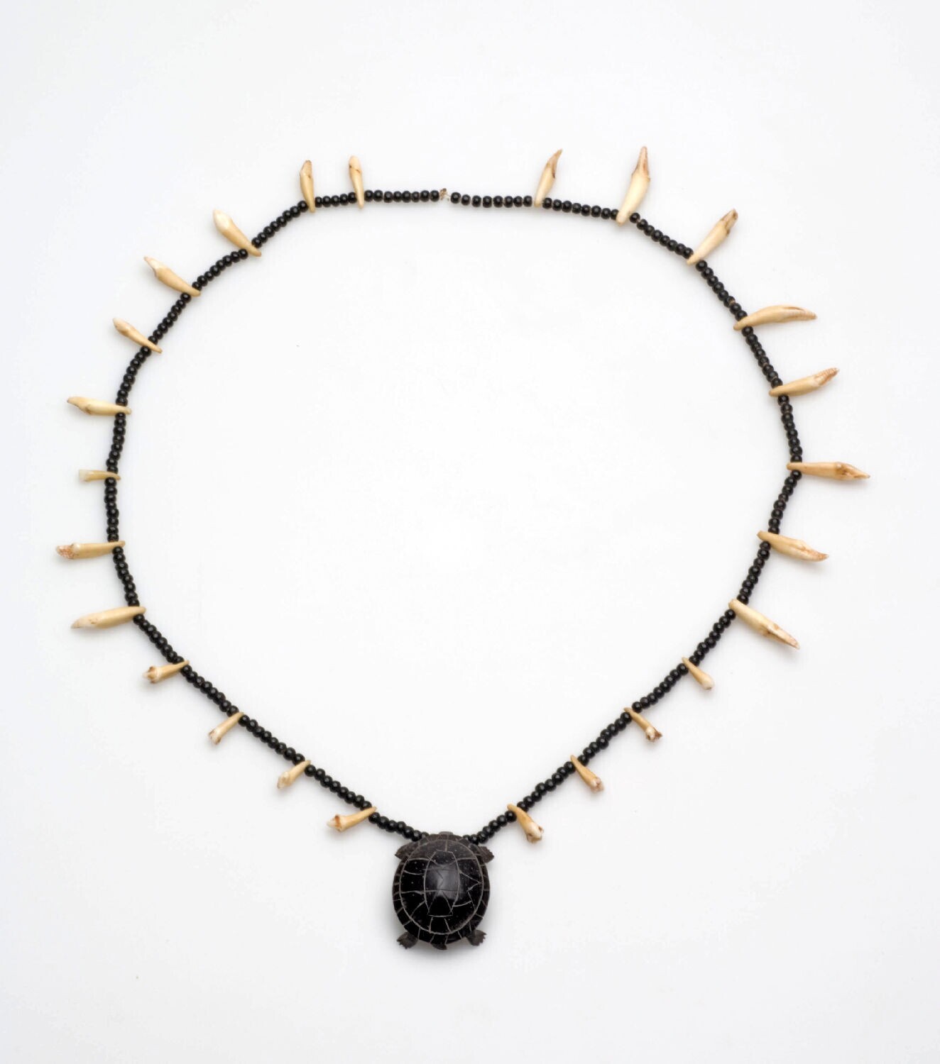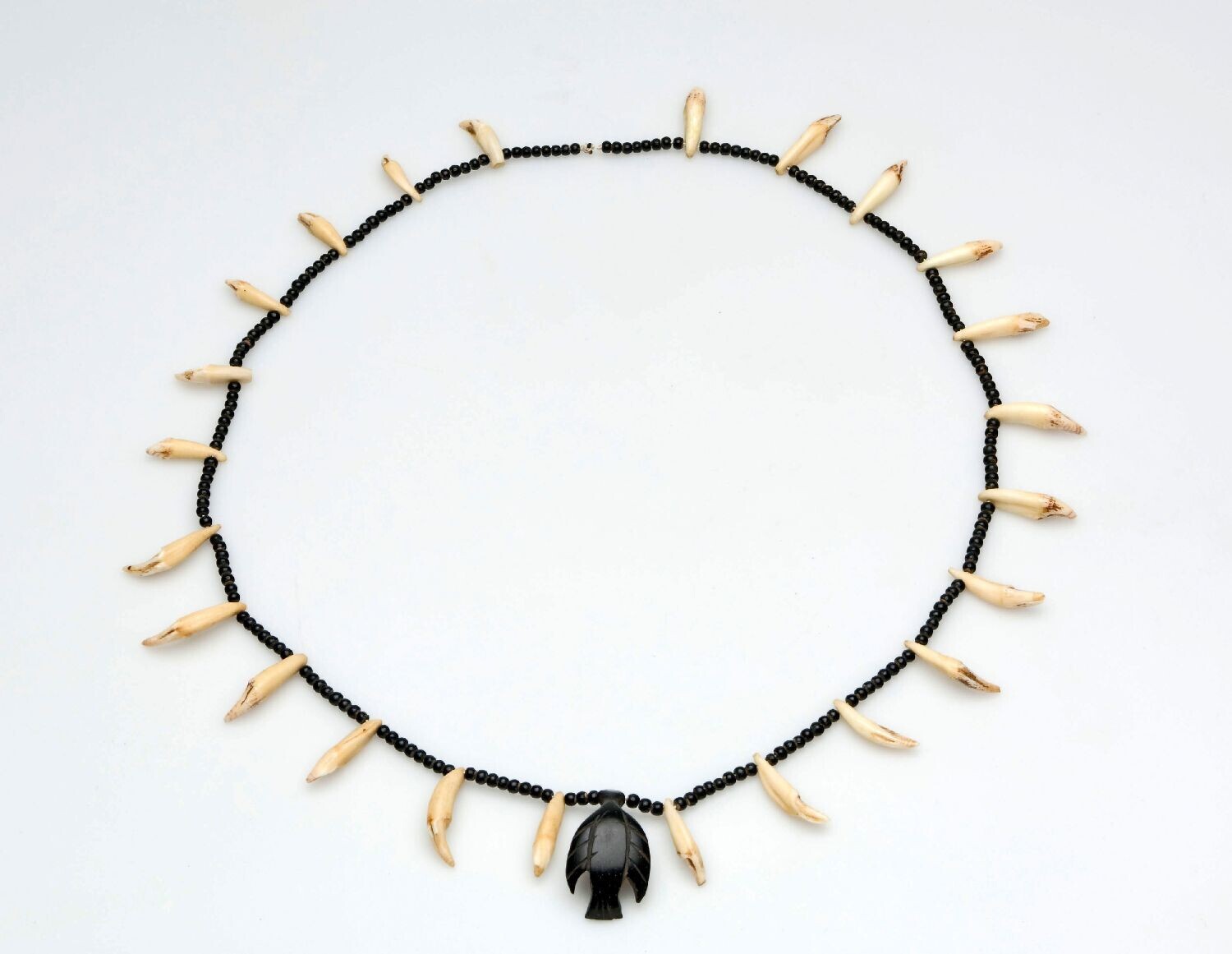 Geregen halsketting van kaaimantanden en de zaden va...