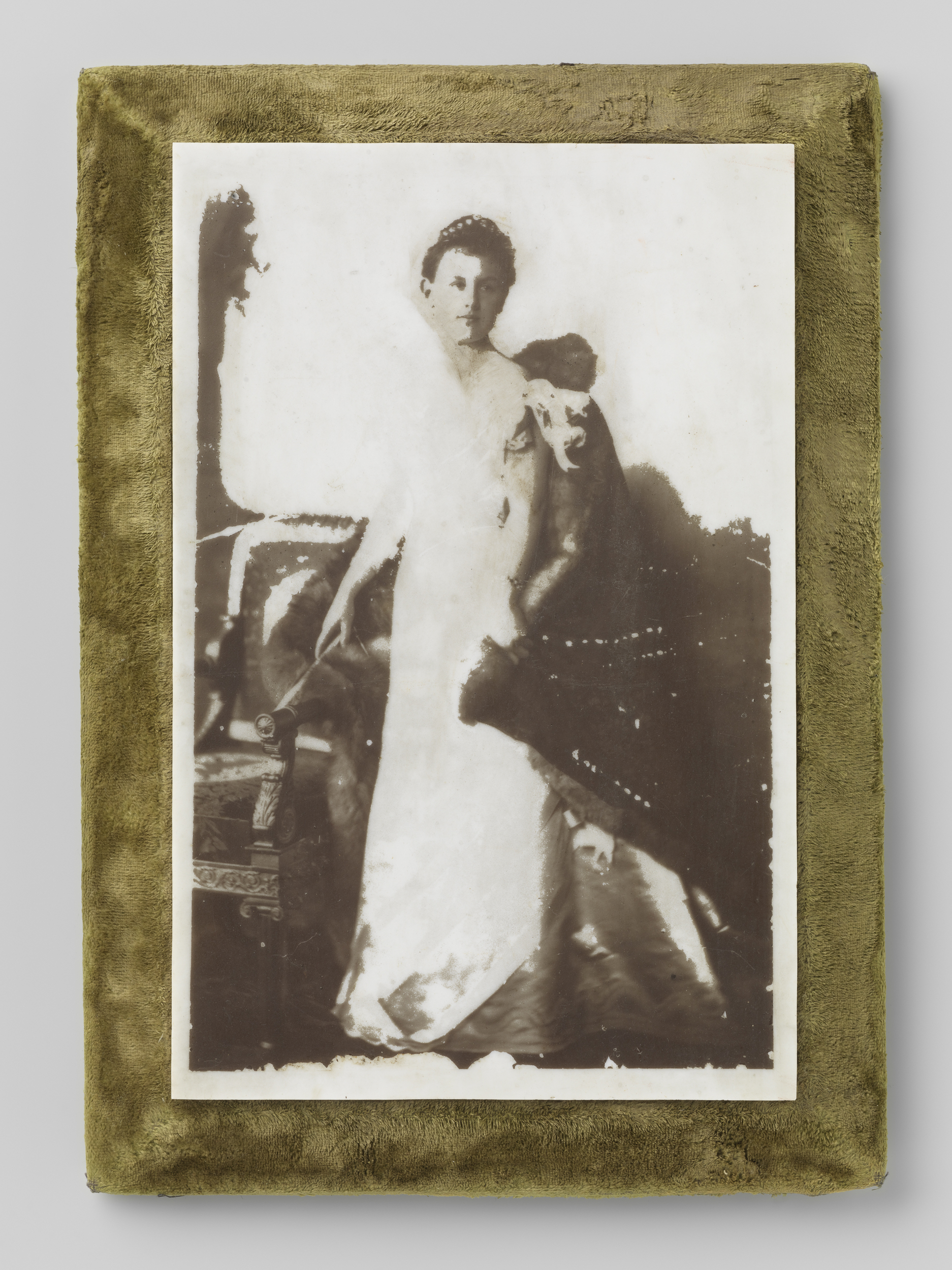Portret van koningin Wilhelmina, staande naast een s...