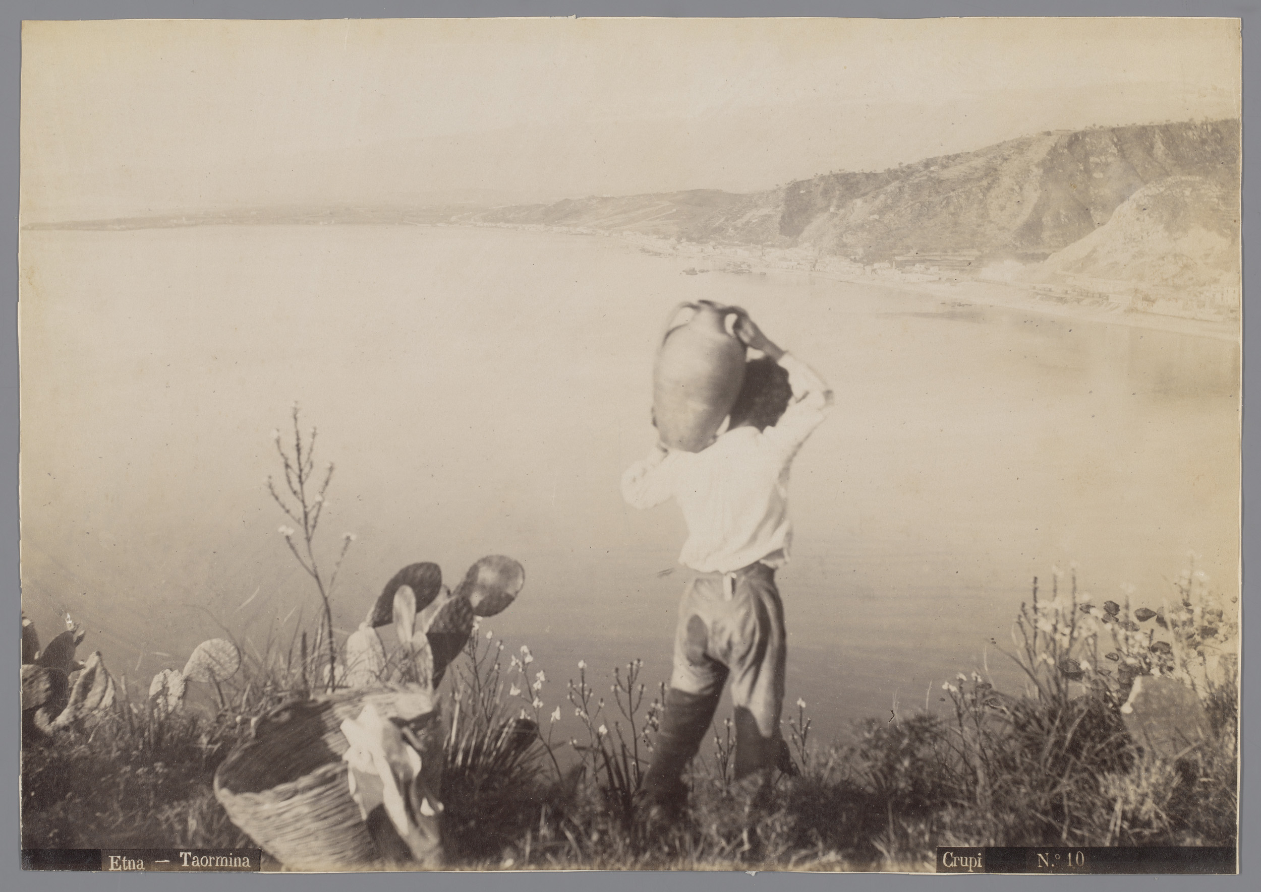 Man met een kruik op zijn rug, staande aan de baai v...