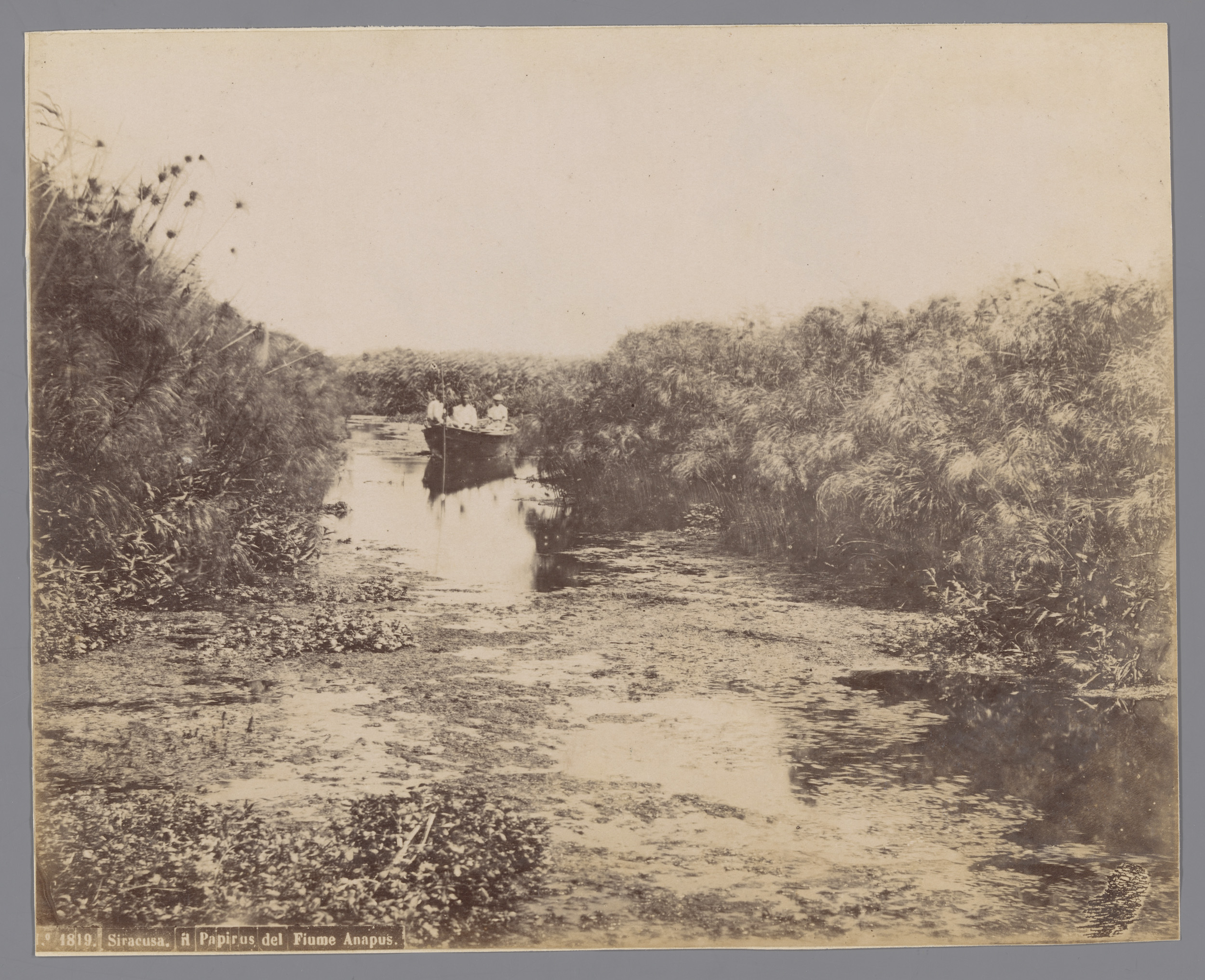 Roeiboot op de rivier Anapo nabij Syracuse, Sicilië