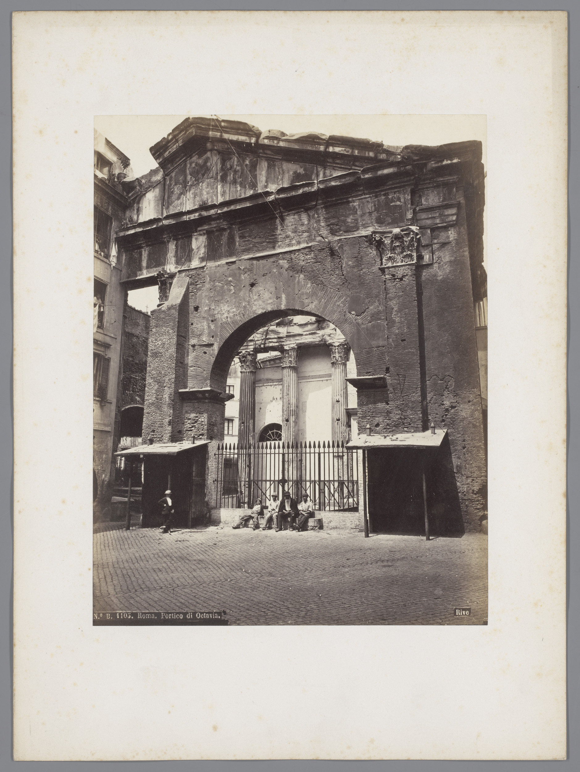 Zittende mensen voor de Porticus van Octavia in Rome