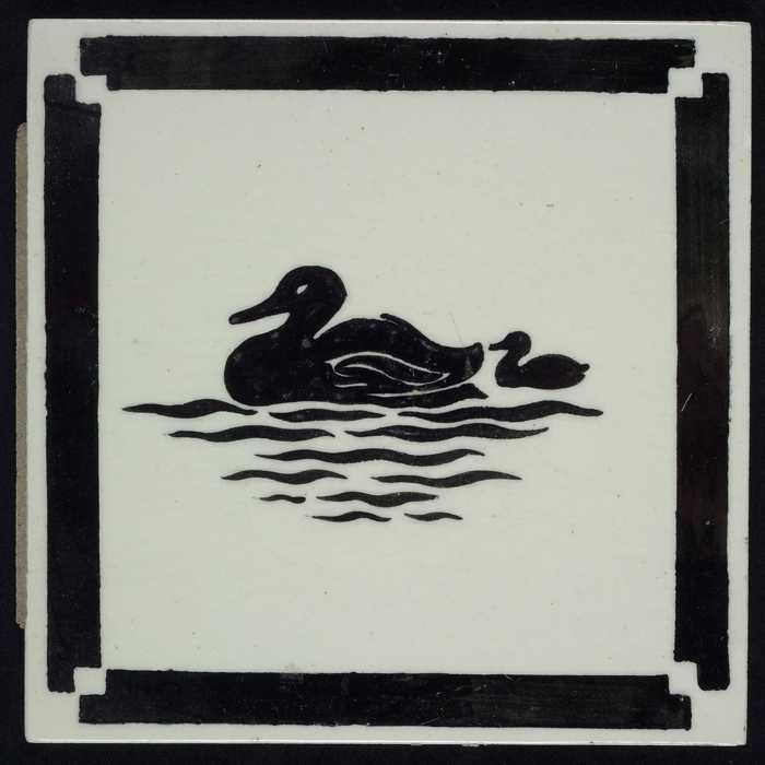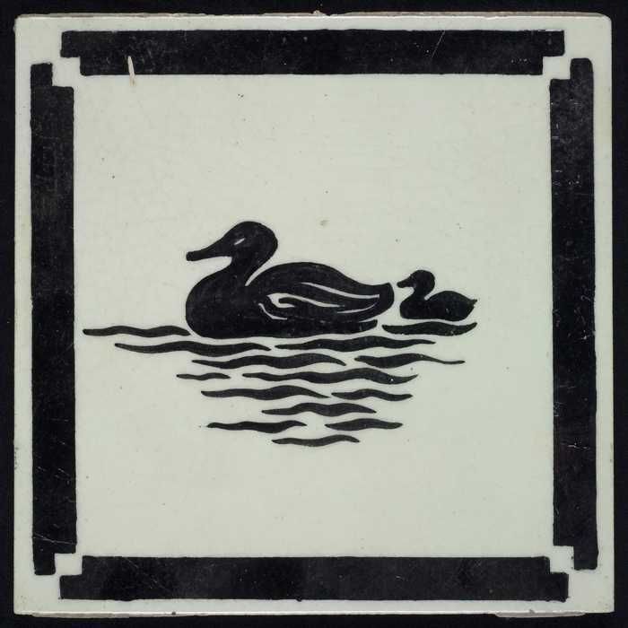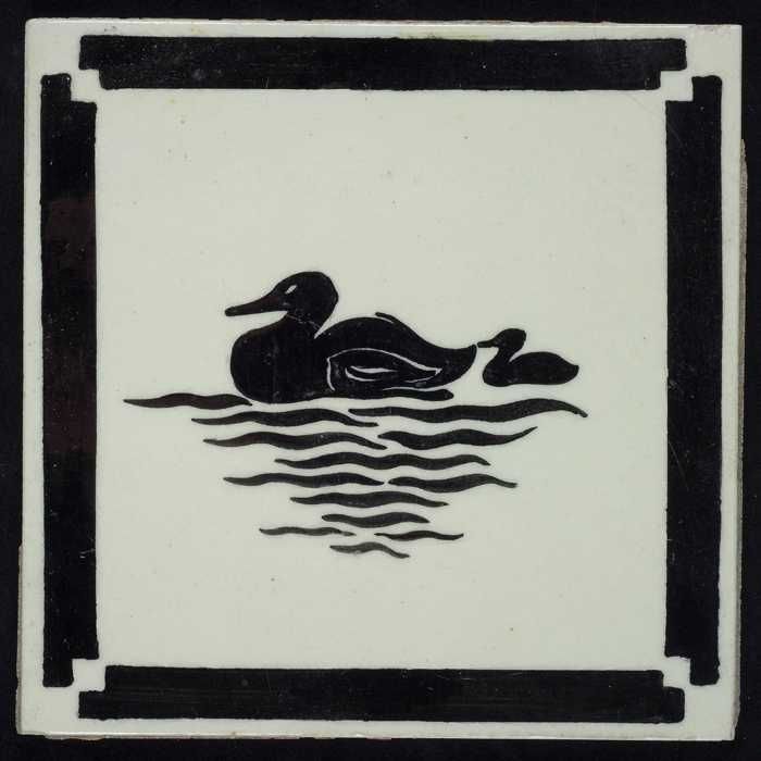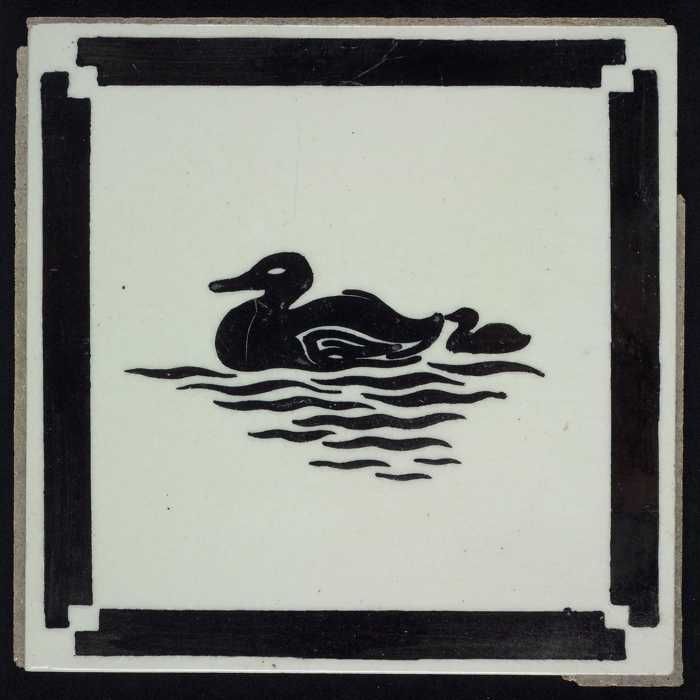 Kindertegel, zwart op wit met eend met jong, randmot...