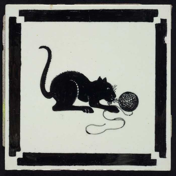 Kindertegel, zwart op wit met een kat spelend met ee...