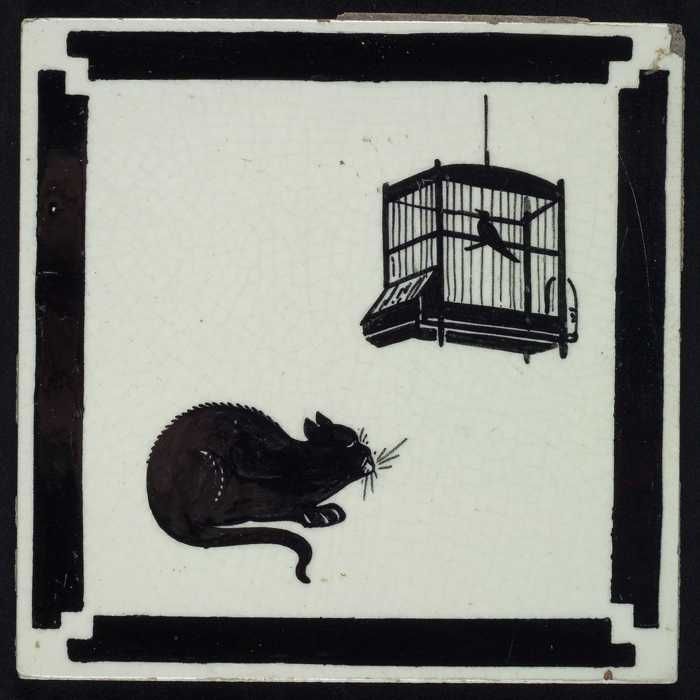 Kindertegel, zwart op wit met een kat loerend naar e...