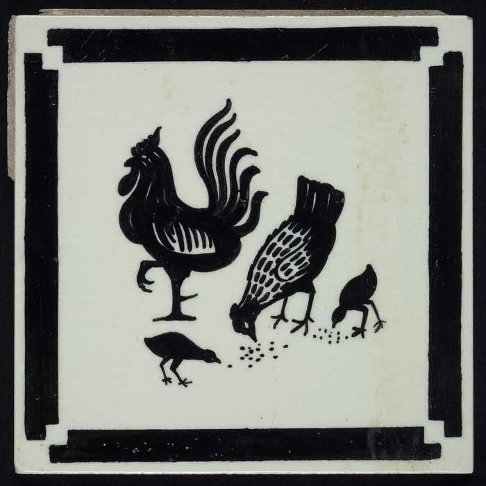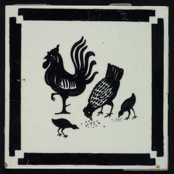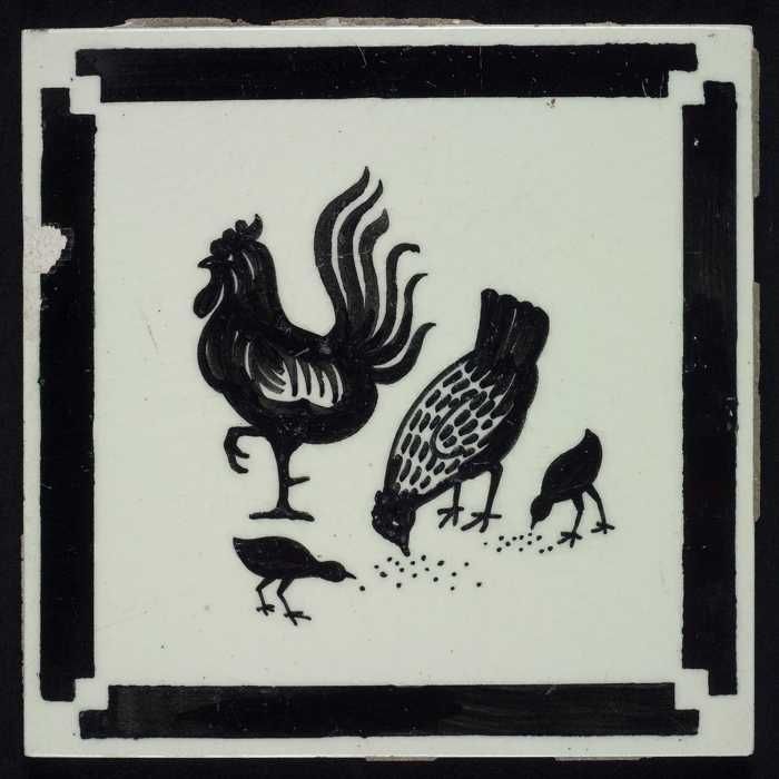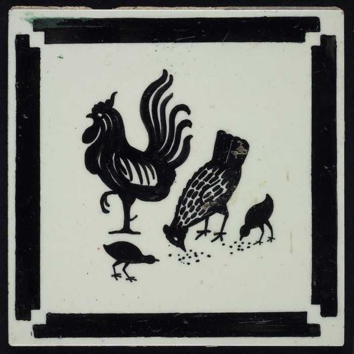 Kindertegel, zwart op wit met een haan, een kip en t...