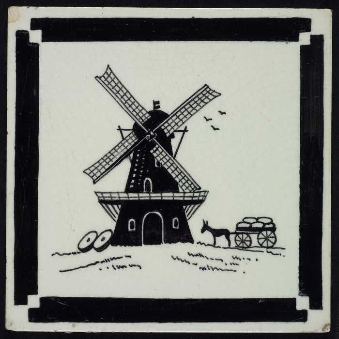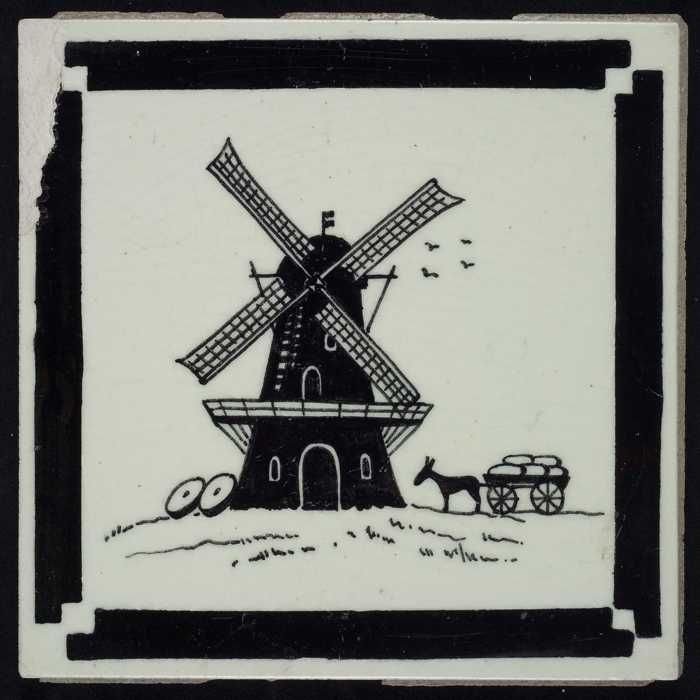 Kindertegel, zwart op wit met een molen en een kar m...