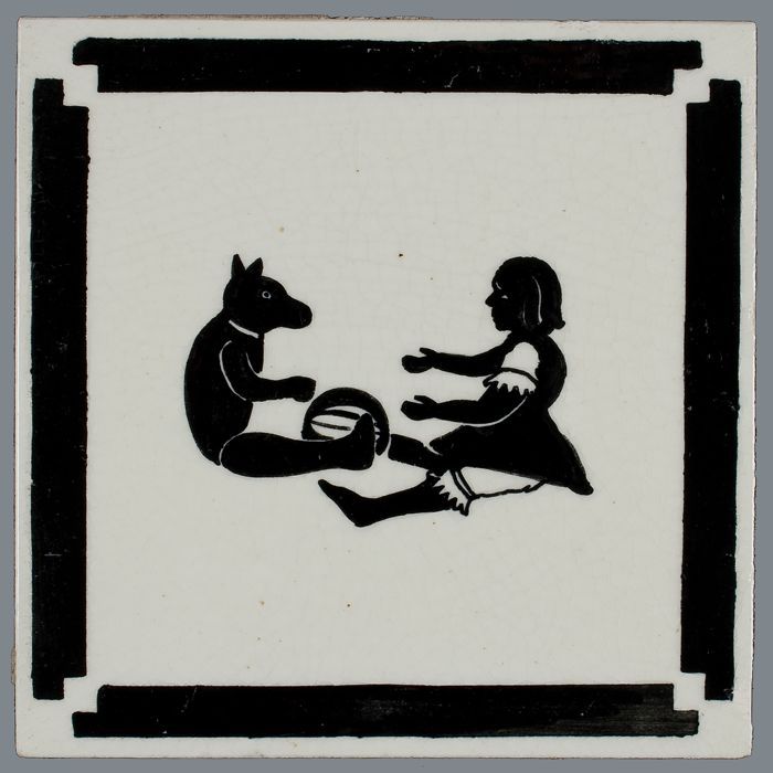 Kindertegel of tafereeltegel met kind en beer in zwa...