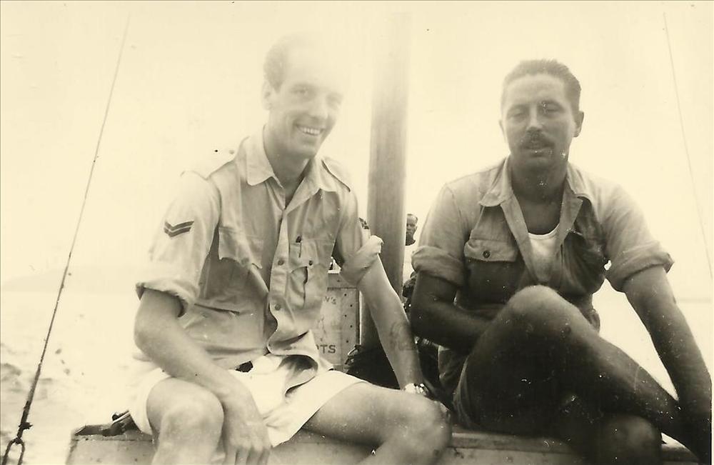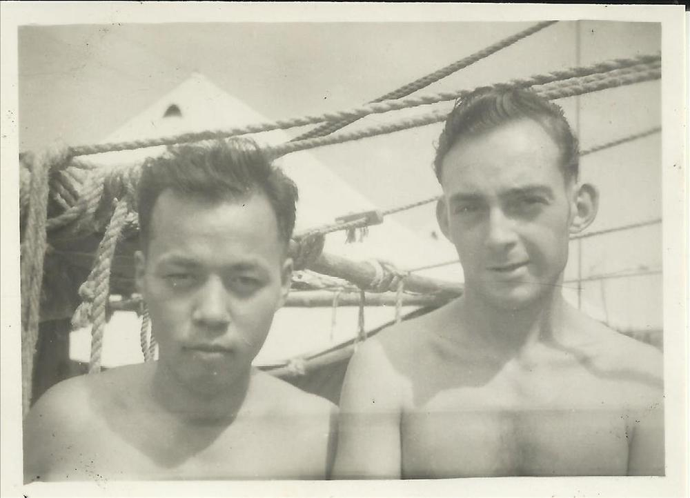 Nieuw-Guinea; marinemensen op voorplecht bootje