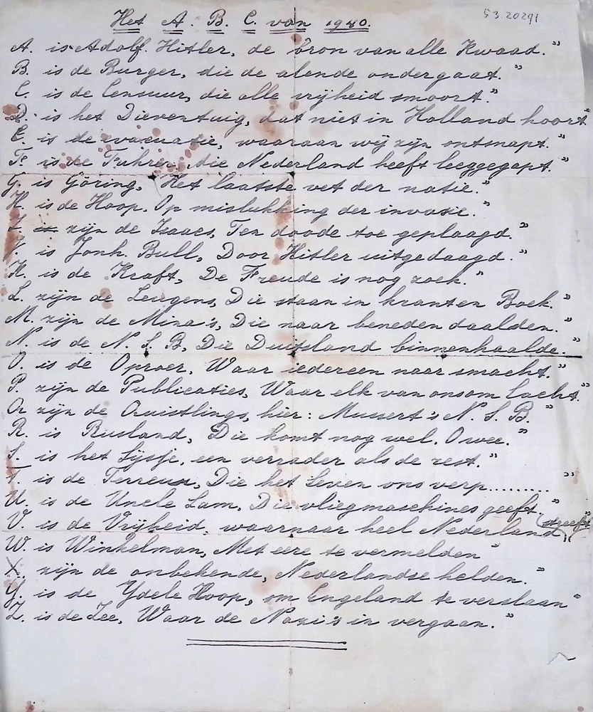 Vel met handgeschreven tekst: "Het A.B.C. van 1940"