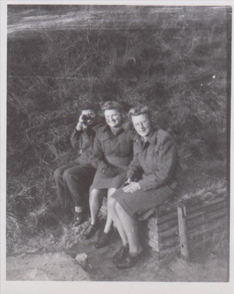Foto van 3 vrouwen in uniform zittend op een "bloemb...