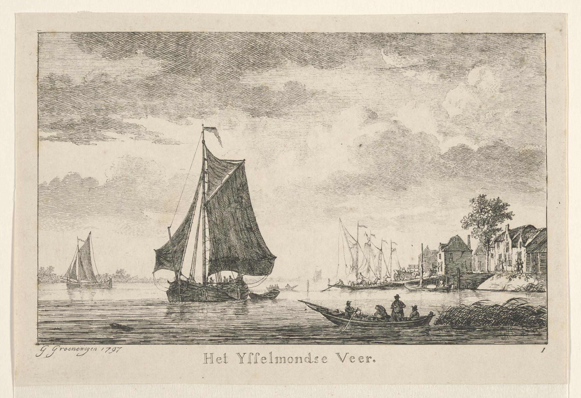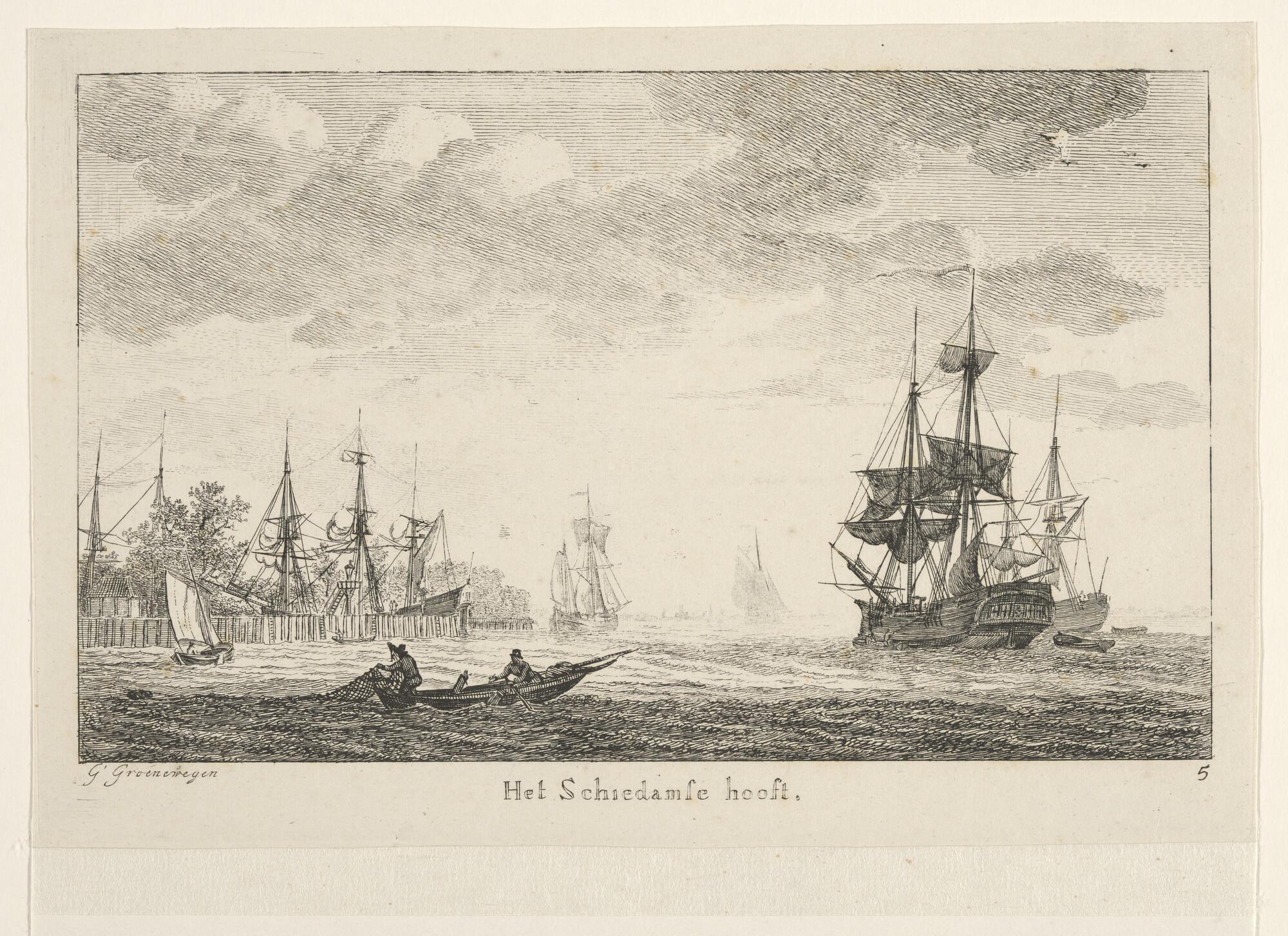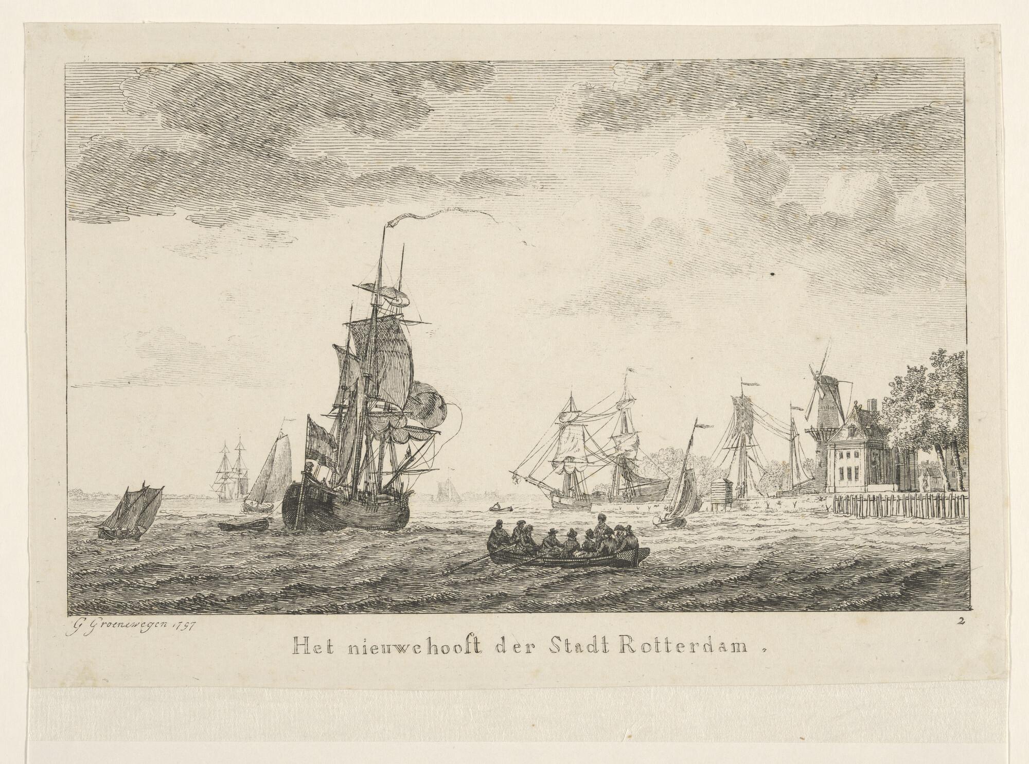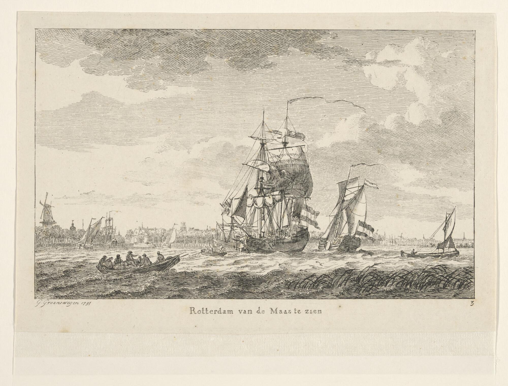 Prent van scheepvaart op de Nieuwe Maas voor Rotterdam